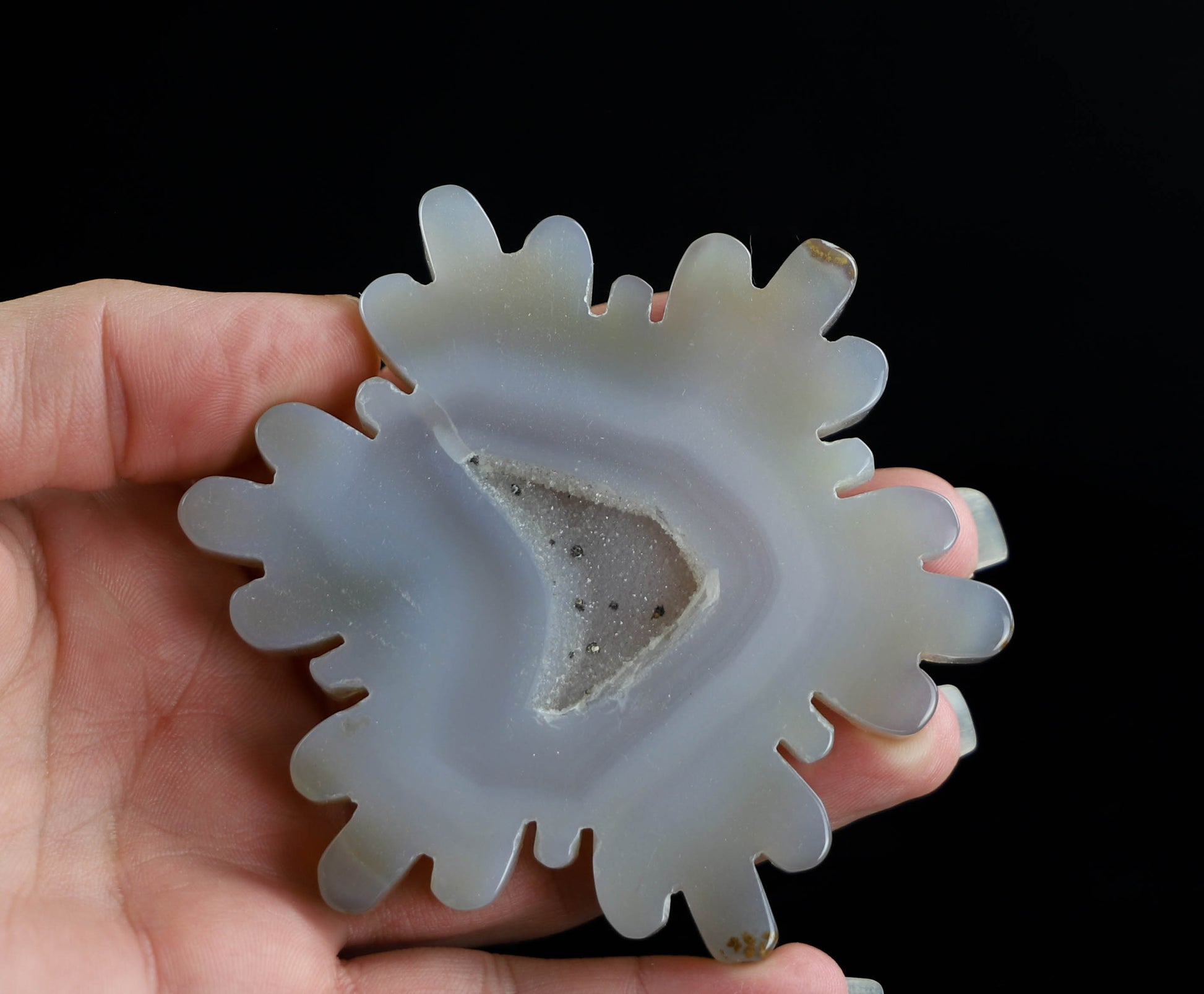 Introducing our exquisite Agate Crystal Snowflake, a truly mesmerizing piece to grace your home this holiday season. Handcrafted with utmost care, this snowflake-inspired crystal ornament showcases the natural beauty of agate crystals in all their glory. Each piece is unique, showcasing intricate patterns and calming hues that are sure to captivate any onlooker. Hang it on your Christmas tree, display it on your mantel, add it to your crystal collection, or gift it to a loved one to add a touch of elegance and a hint of enchantment to your winter wonderland. Elevate your holiday décor and home décor with the timeless charm of our Agate Crystal Snowflake.