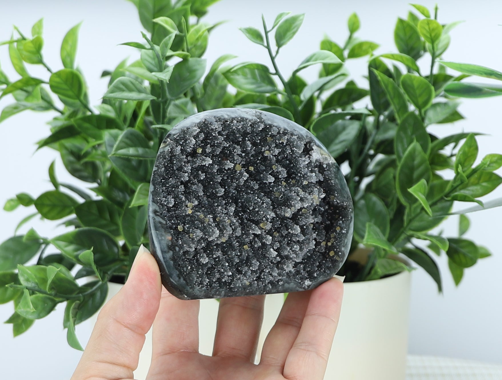 Bring a touch of raw elegance and powerful energy into your space with this striking Black Amethyst Crystal, with yellow calcite cubes. A rare and captivating variation of traditional amethyst, black amethyst features deep, smoky hues and densely packed crystal points that shimmer with subtle inner light.