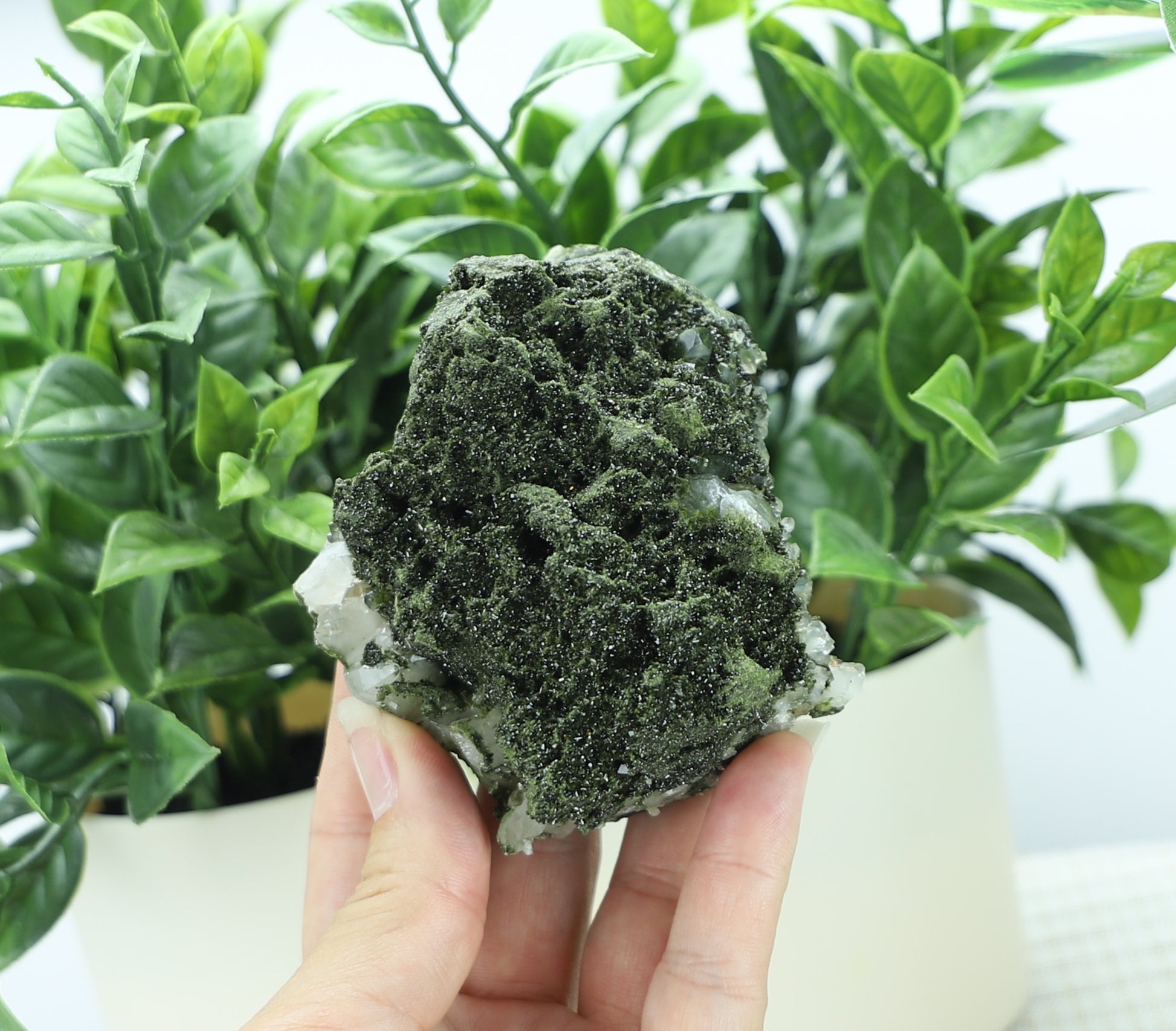 Bring the magic of a fairy forest into your space with these stunning quartz and epidote crystals. Each piece is 100% nature made, filled with sparkling green inclusions that resemble moss, vines, and hidden groves.