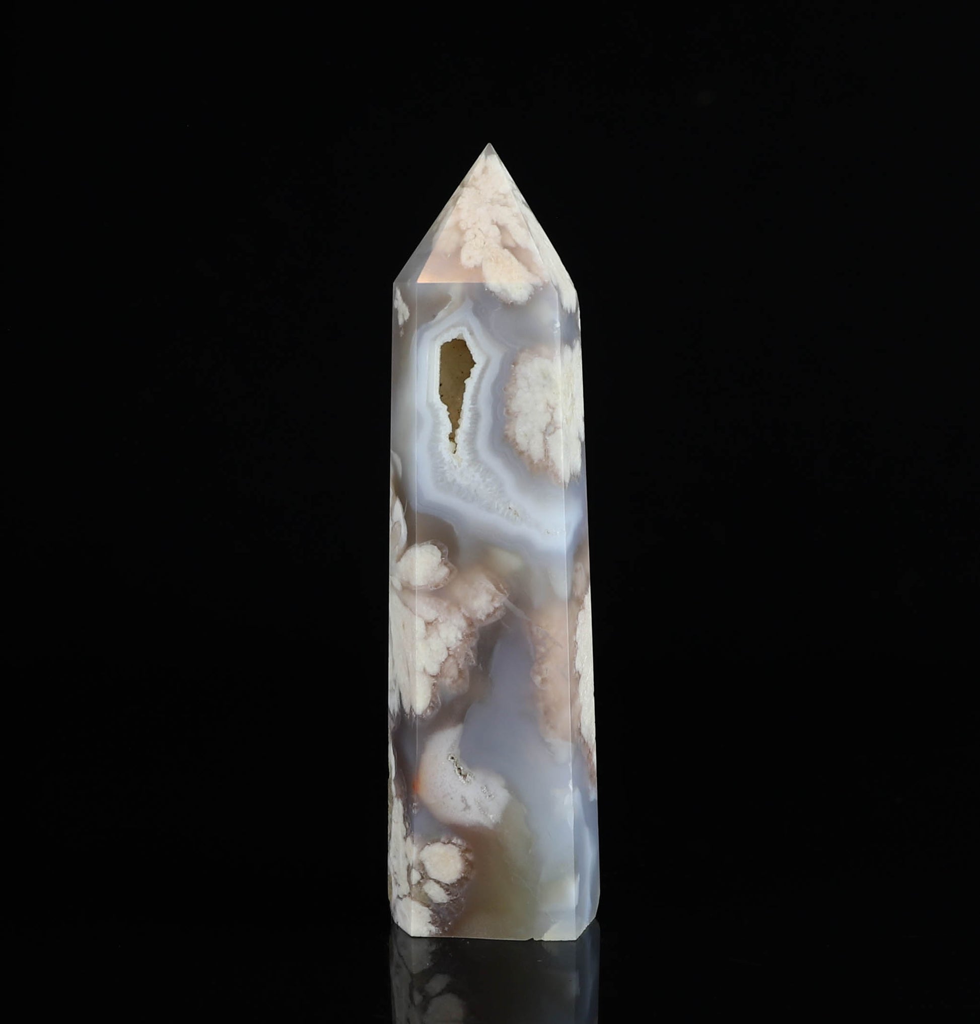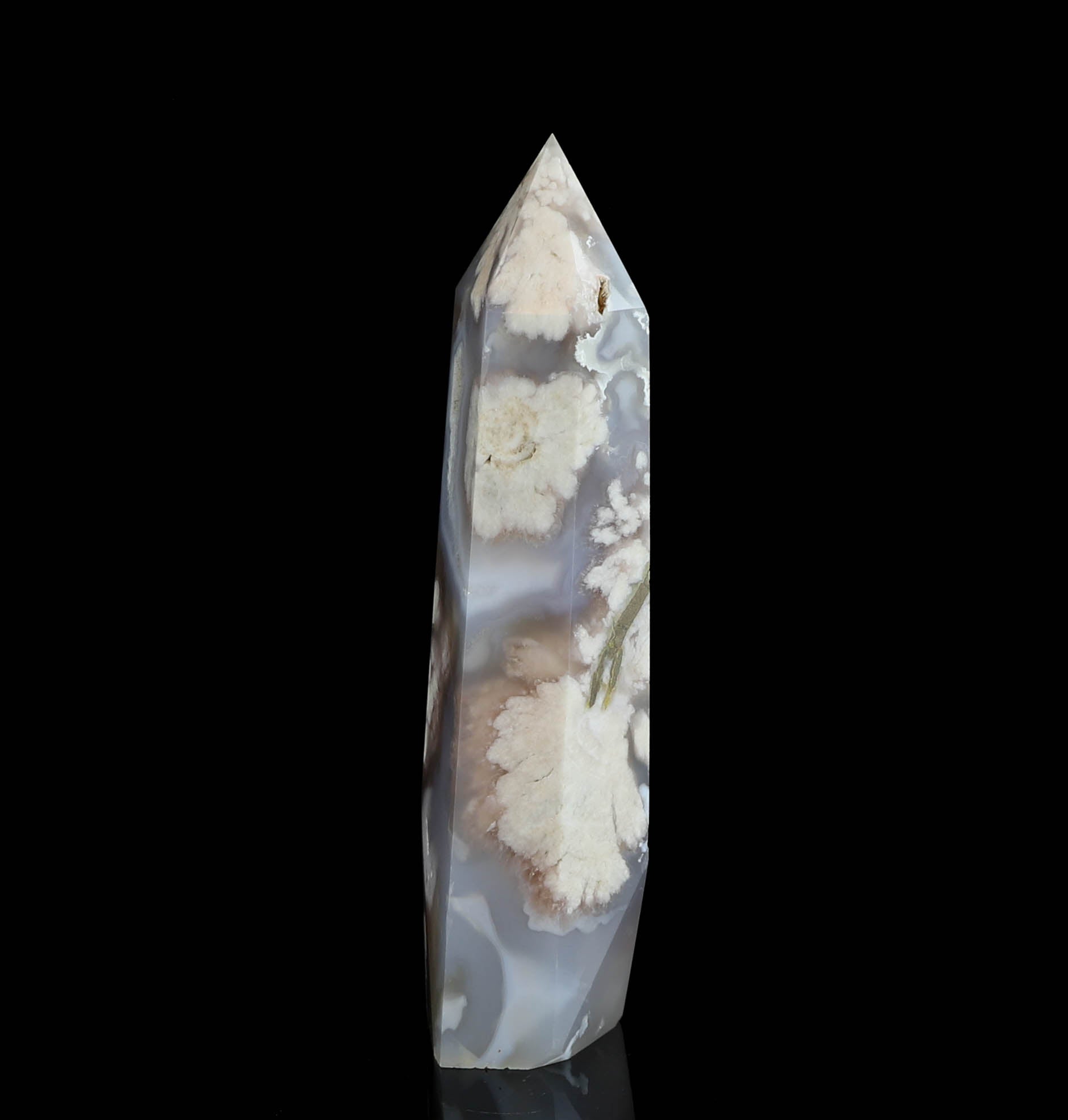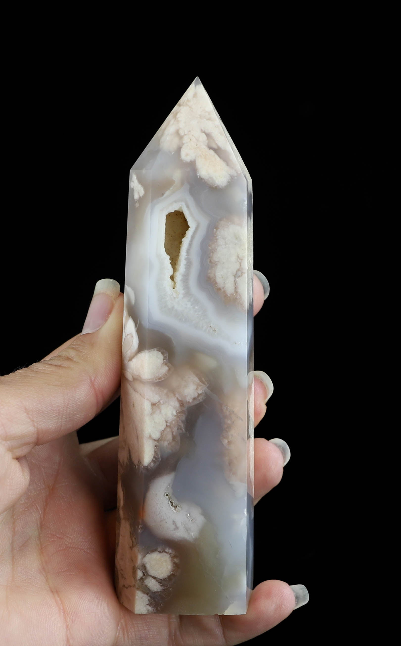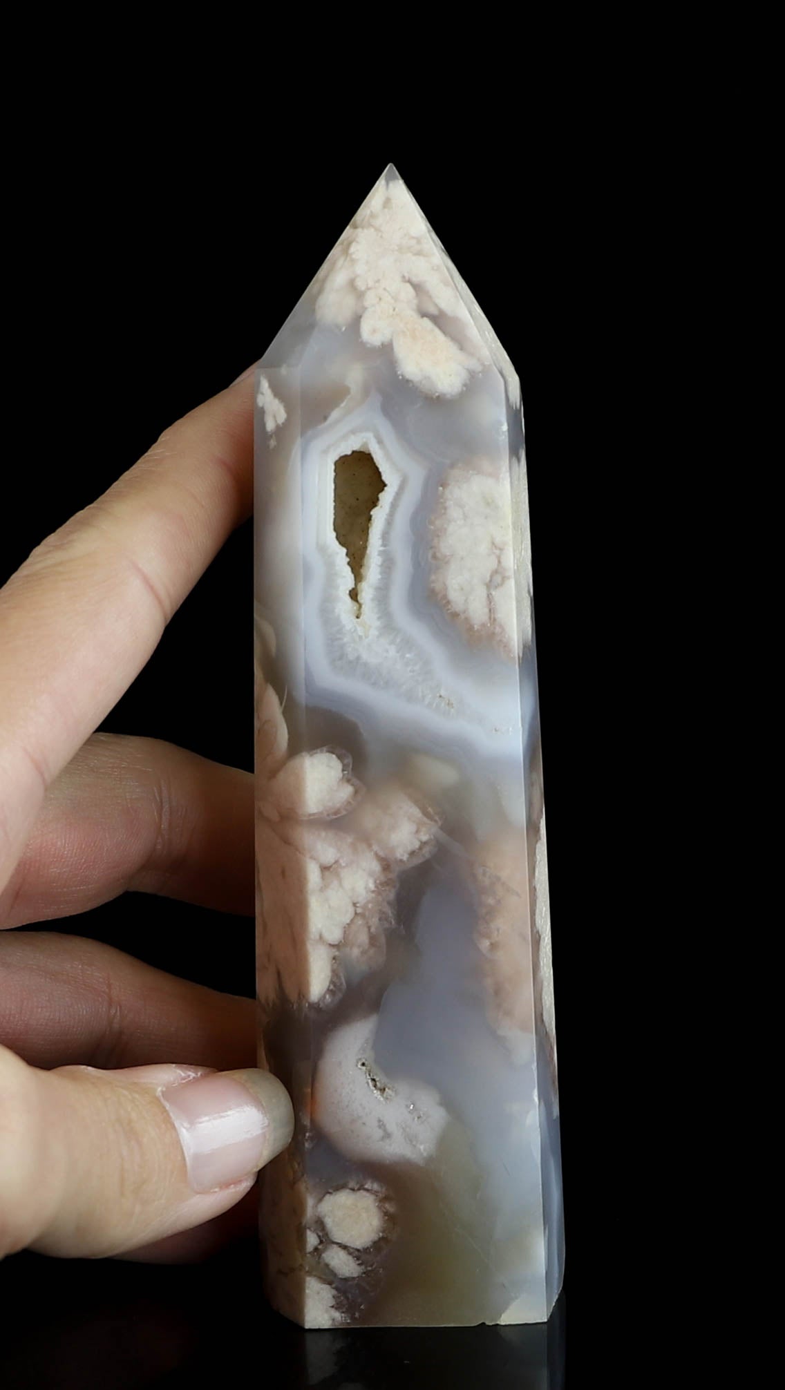 Introducing our stunning Flower Agate Tower! Crafted with meticulous attention to detail, this enchanting crystal tower showcases the mesmerizing beauty of pink flower agate. With its bold and elegant pink & blue hues gracefully intertwining with delicate flower plumes, this tower is truly a piece of art. Known for its healing, love, and calming properties, flower agate emanates a soothing energy that promotes emotional healing and stability. Whether used as a decorative centerpiece, a meditation aid, a reiki healing tool, or a thoughtful gift, this unique agate point is sure to add a touch of natural beauty and tranquility to any crystal collection. Embrace the captivating allure of flower agate with this exquisite tower in your collection.