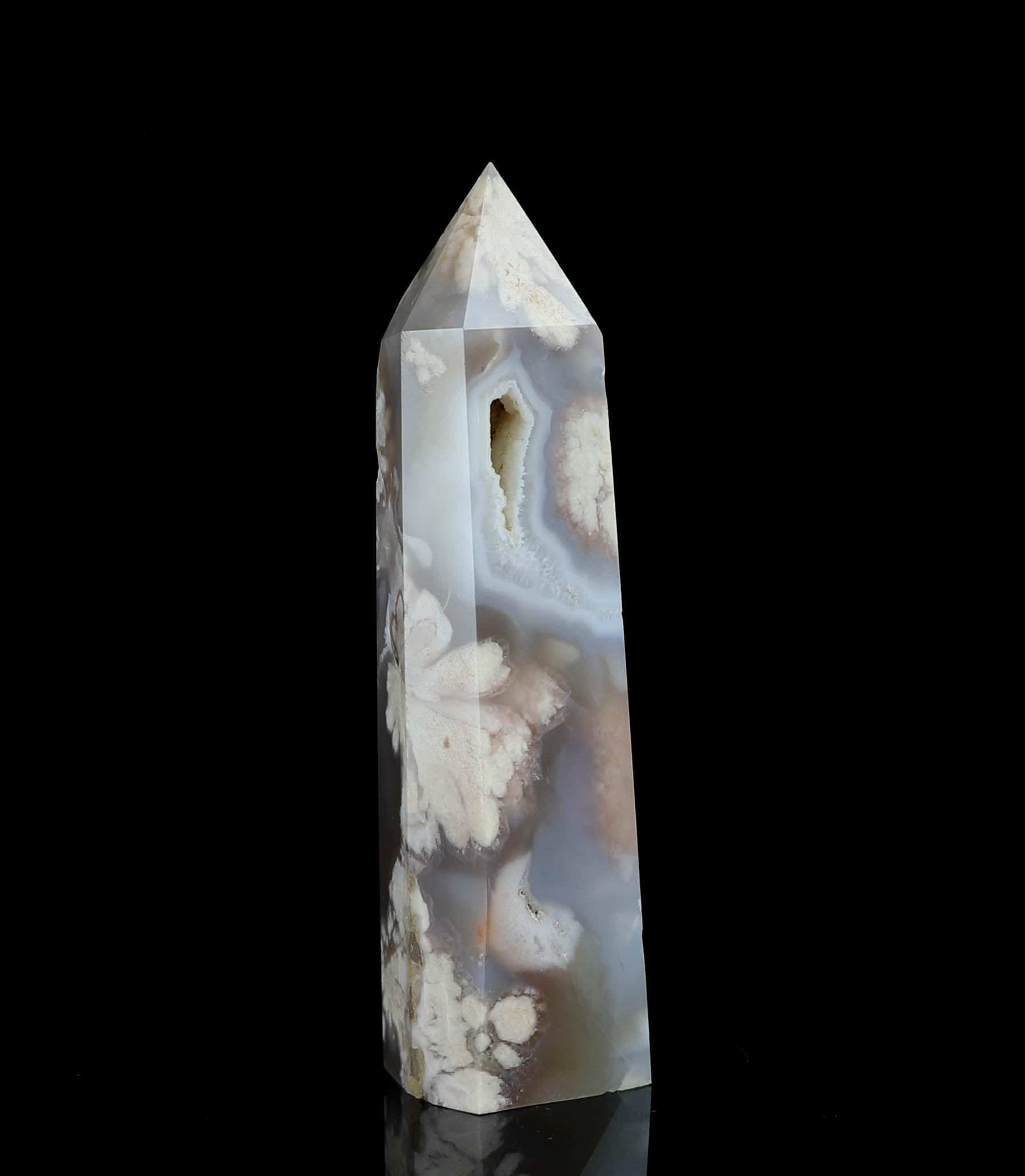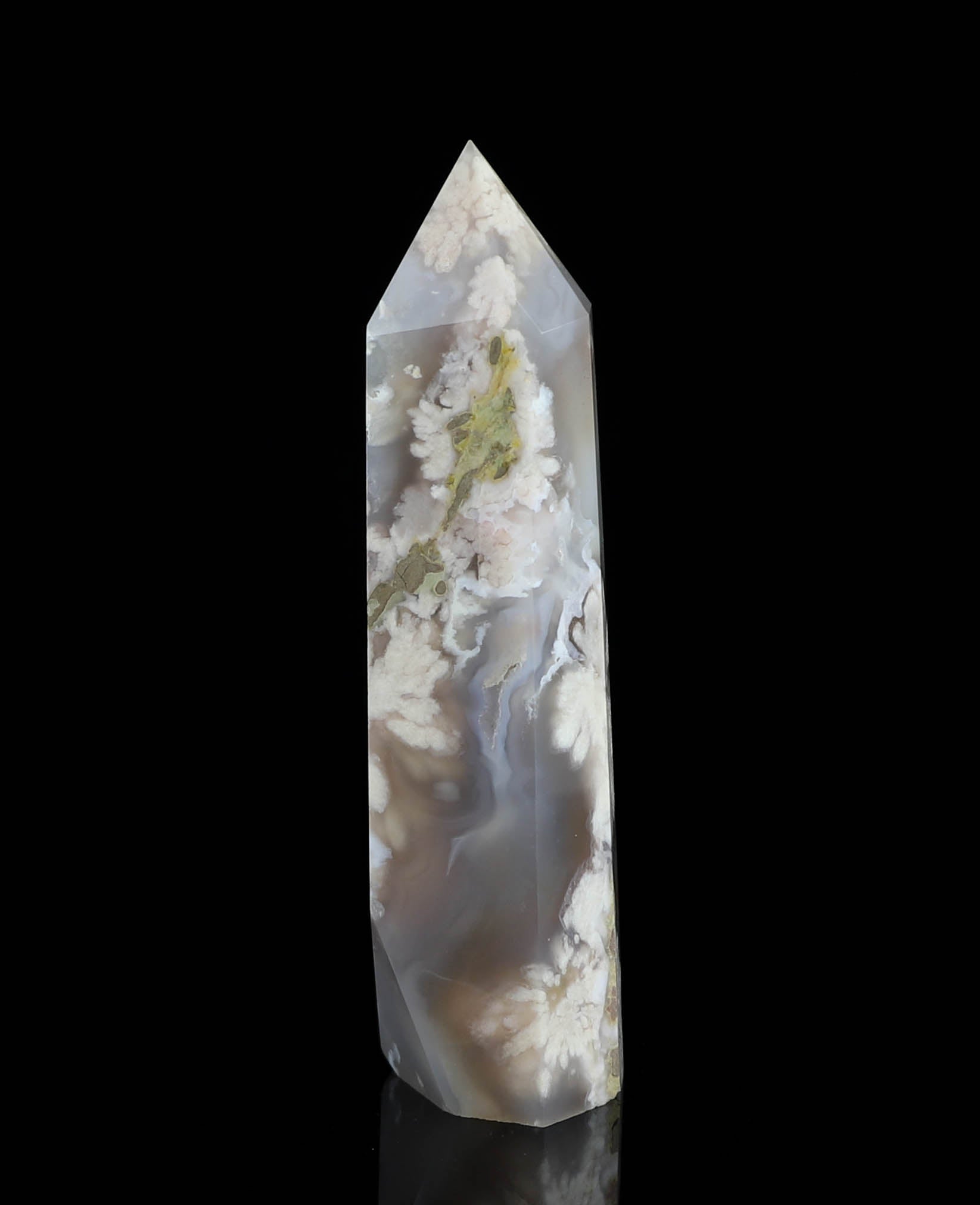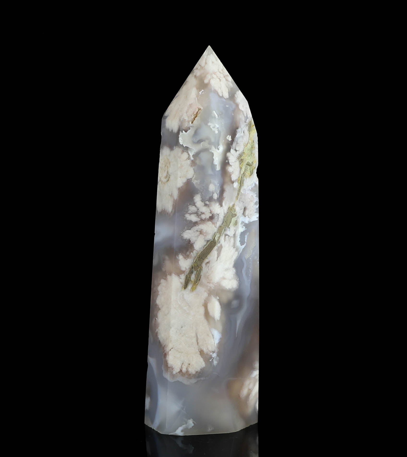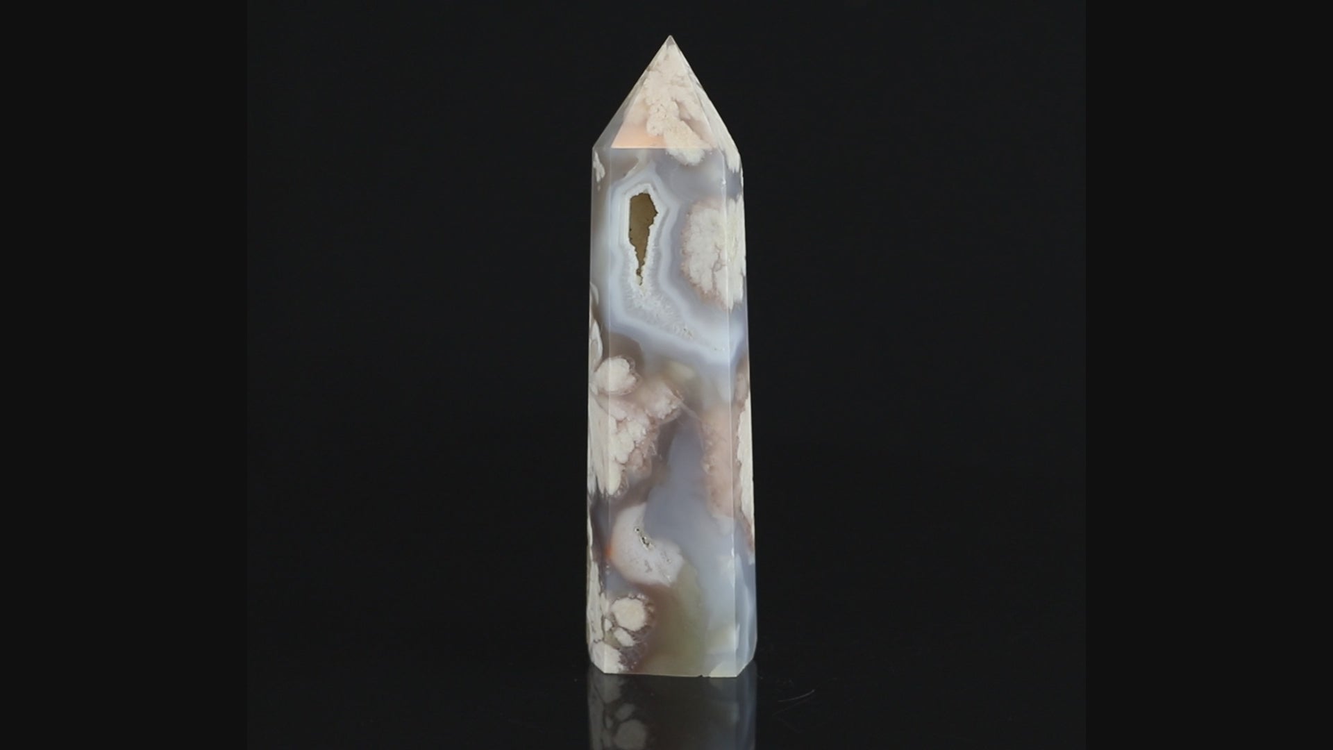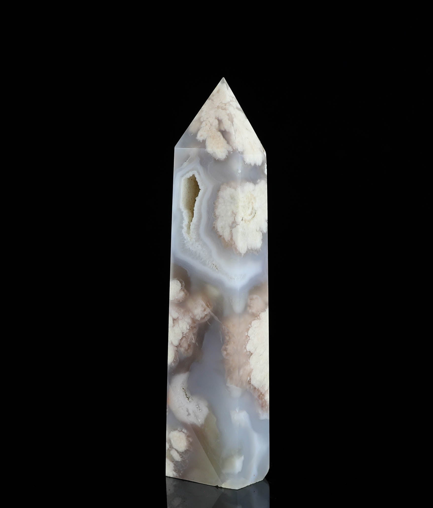 Introducing our stunning Flower Agate Tower! Crafted with meticulous attention to detail, this enchanting crystal tower showcases the mesmerizing beauty of pink flower agate. With its bold and elegant pink & blue hues gracefully intertwining with delicate flower plumes, this tower is truly a piece of art. Known for its healing, love, and calming properties, flower agate emanates a soothing energy that promotes emotional healing and stability. Whether used as a decorative centerpiece, a meditation aid, a reiki healing tool, or a thoughtful gift, this unique agate point is sure to add a touch of natural beauty and tranquility to any crystal collection. Embrace the captivating allure of flower agate with this exquisite tower in your collection.