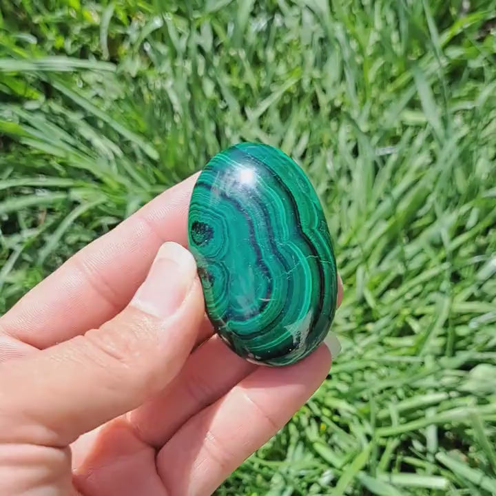 Introducing our exquisite Natural Malachite Palm Stone, a true beauty that will captivate your heart and soul! Crafted from the finest malachite, each stone boasts unique patterns and a vibrant green hue that will effortlessly elevate your crystal collection. With its smooth polished surface and comfortable palm-size, this palm stone is perfect for meditation, healing rituals, and channeling positive energy. The natural variations in color and shape make each piece a one-of-a-kind treasure. Bring the grounding and protective properties of malachite into your life with this stunning palm stone, a must-have for crystal enthusiasts and collectors alike.