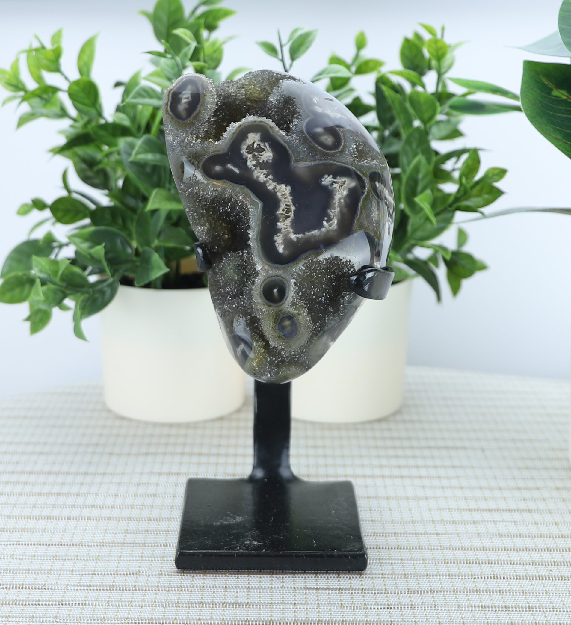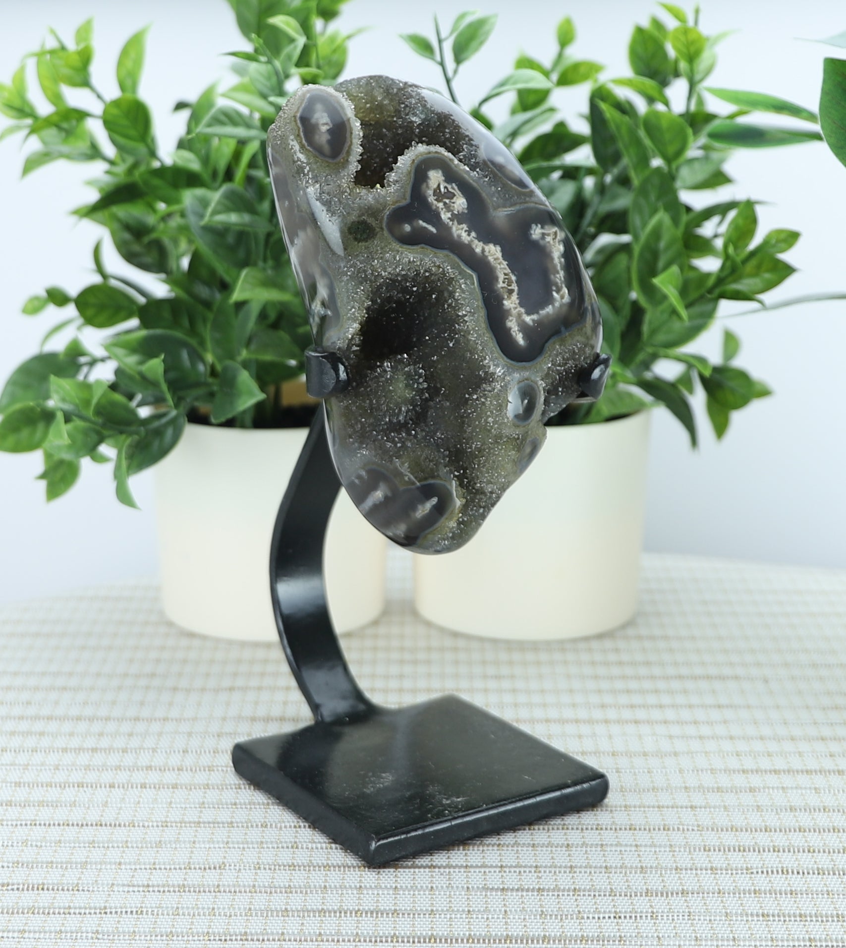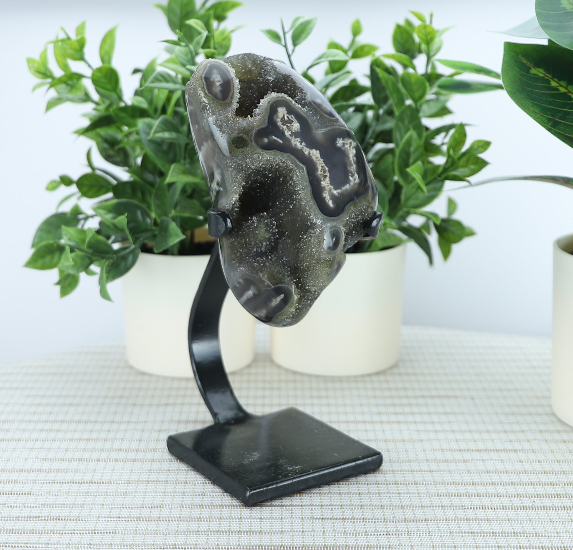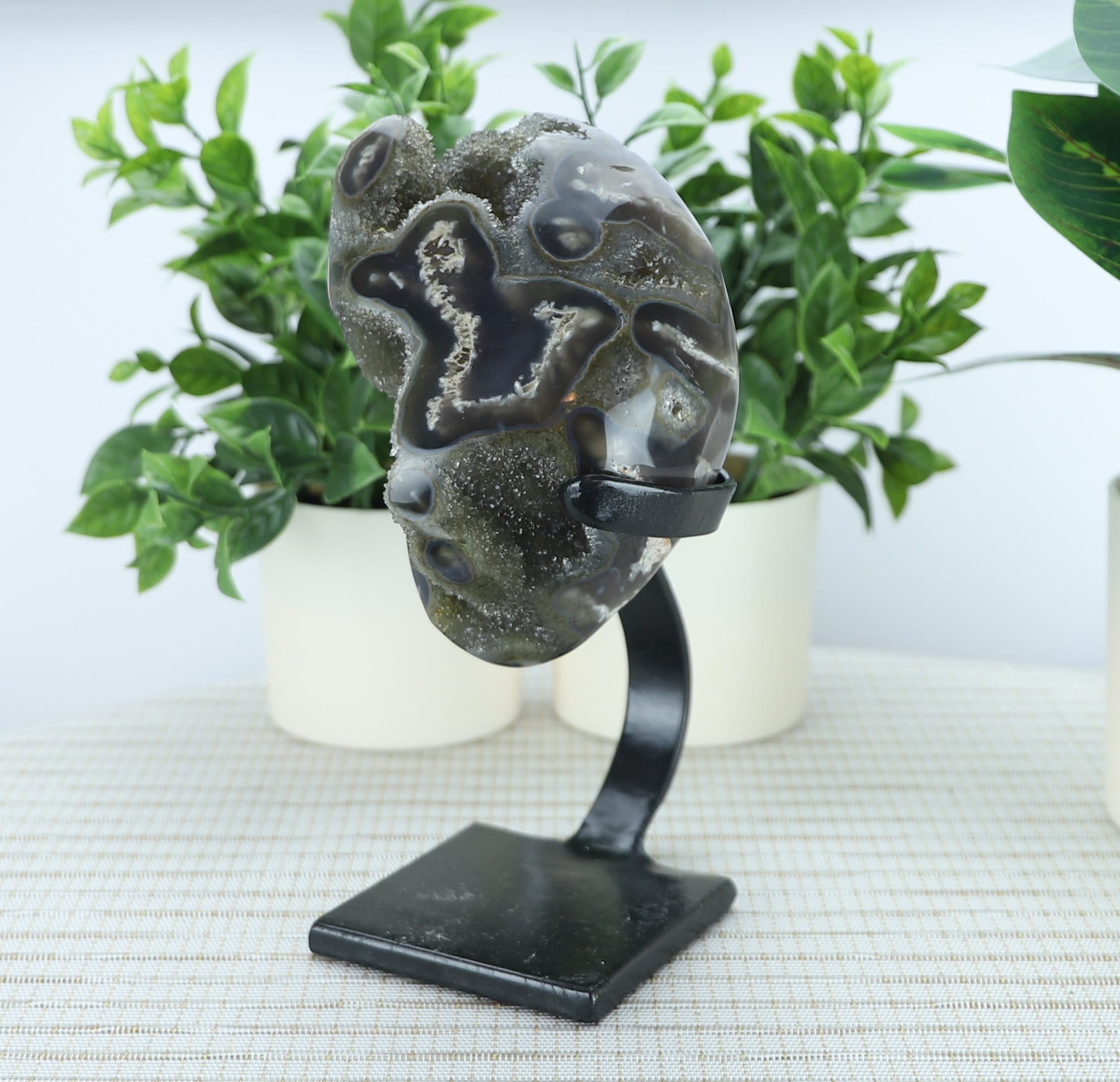 This one-of-a-kind crystal features soft sage and olive hues layered with shimmering clarity, revealing intricate inner landscapes that feel almost sculpted by hand. Crystalline points catch the light beautifully, creating a gentle sparkle that shifts with every angle. Set on a minimalist black metal stand, this piece feels both modern and timeless—a natural sculpture that brings serenity and depth to any room.