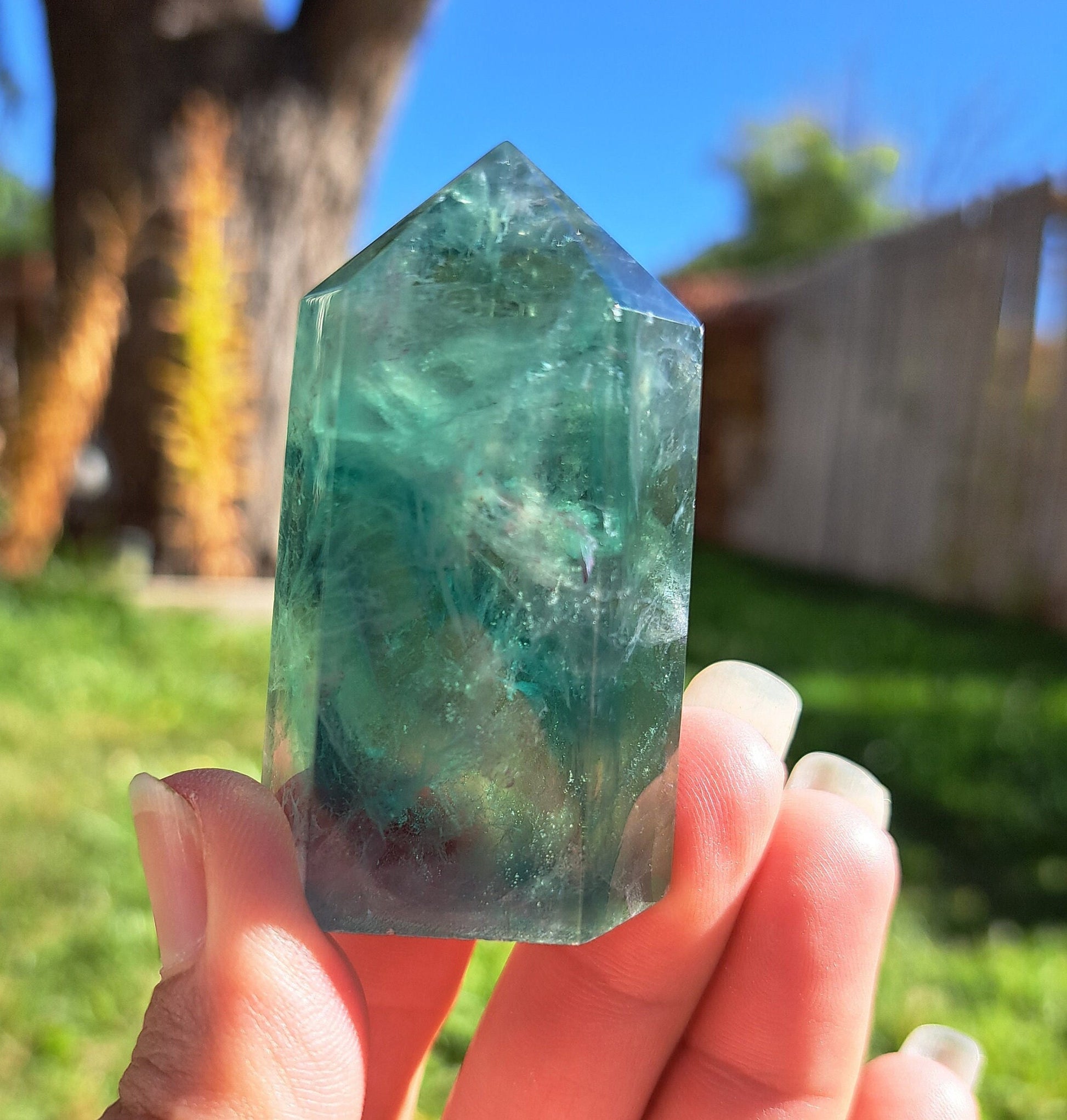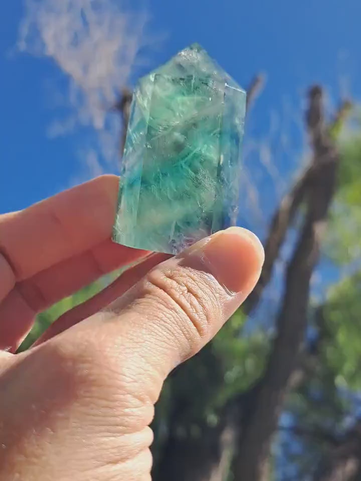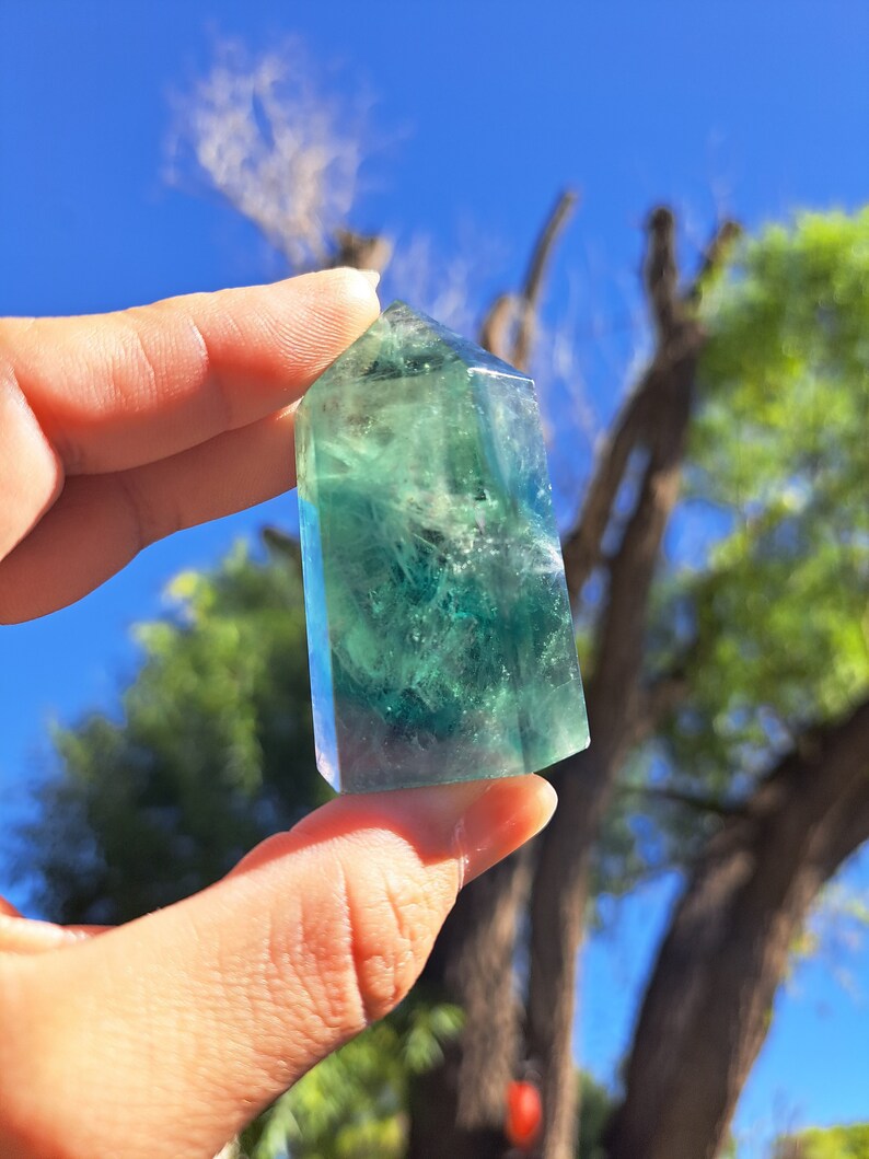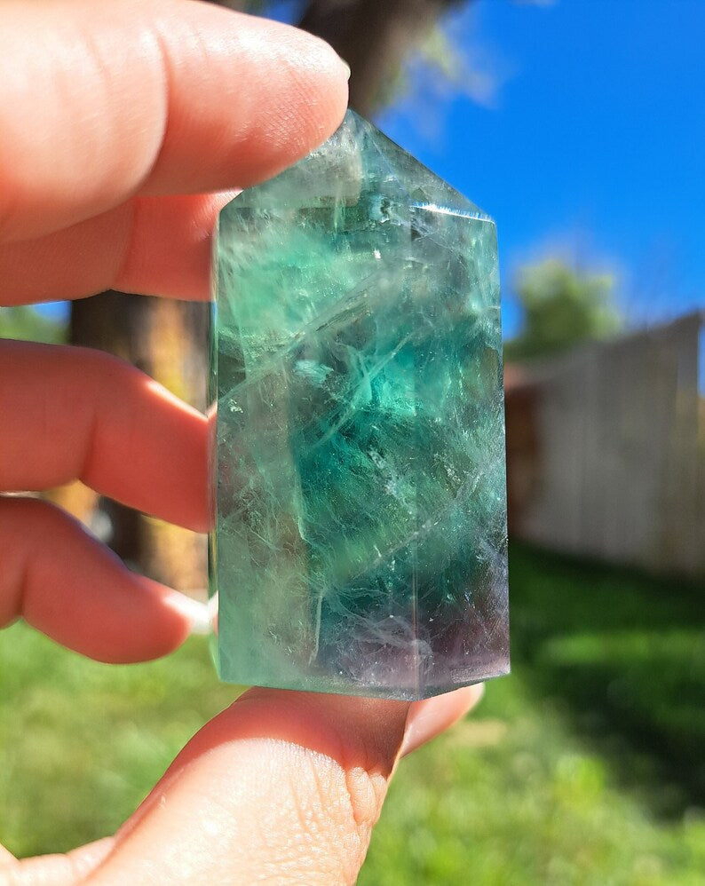 Introducing our stunning Green Fluorite Tower! This exquisite crystal beauty is sure to captivate and mesmerize. Featuring gorgeous natural deep green color, this Fluorite tower is mesmerizing. Handcrafted with precision and love, this tower stands bold as a symbol of spiritual growth and harmony. Its iridescent clarity enhances your intuition and channels positive energy into your sacred space. Whether used for meditation, crystal healing, or simply as a captivating home décor piece, this Green Fluorite Tower is a must-have for your crystal collection. Bring a touch of enchantment to your life and let the vibrant energies of this stunning tower illuminate your space.