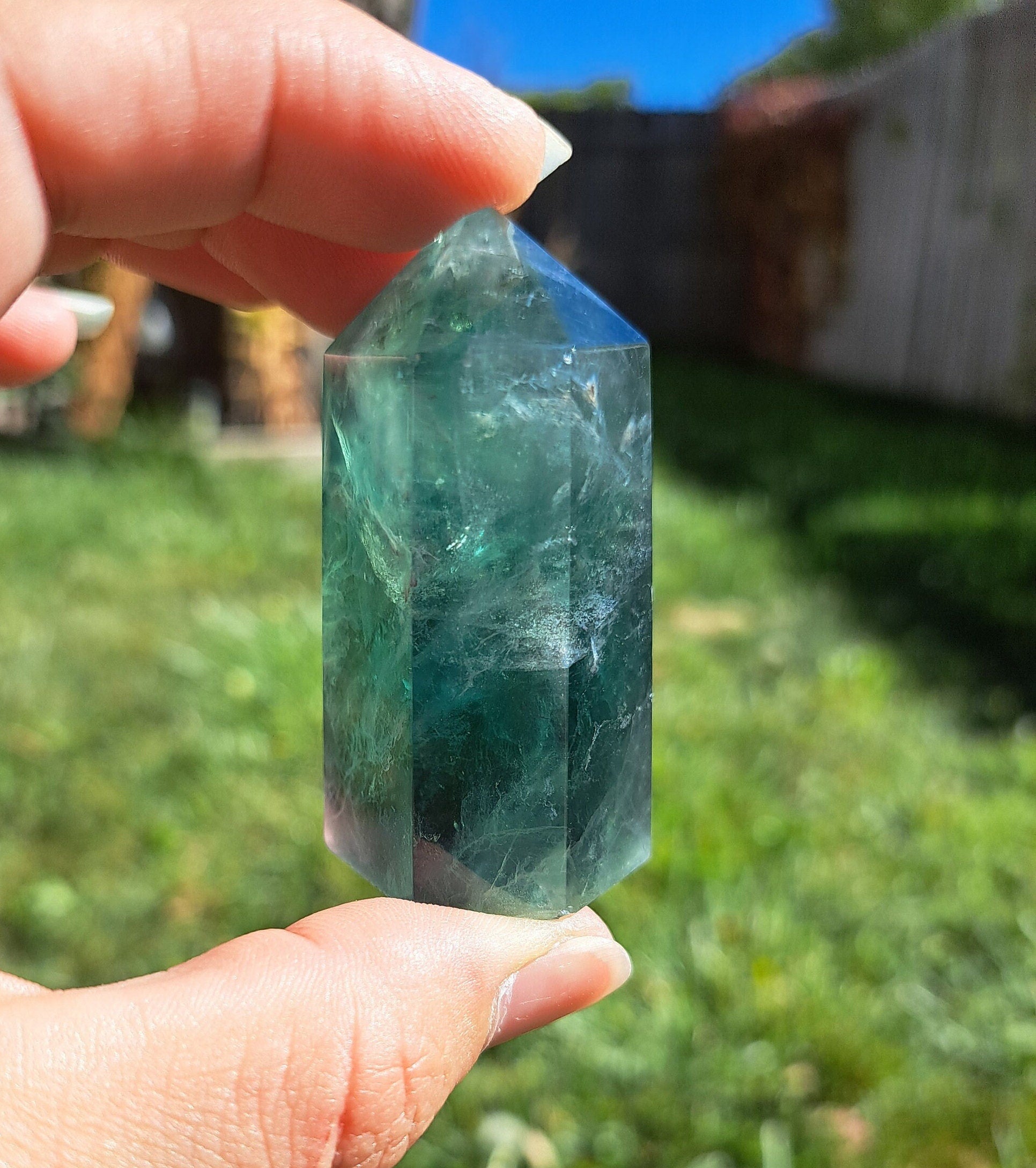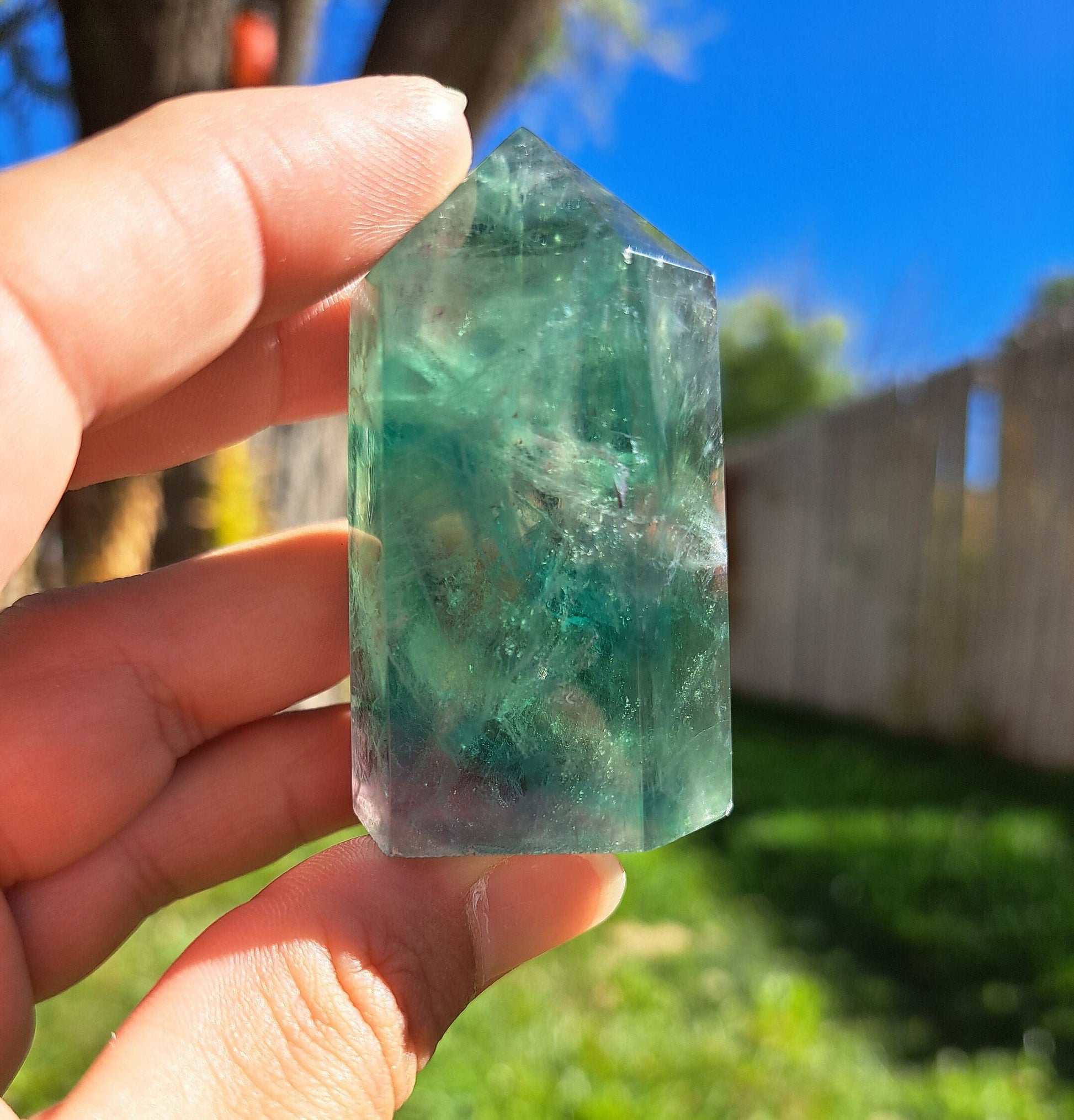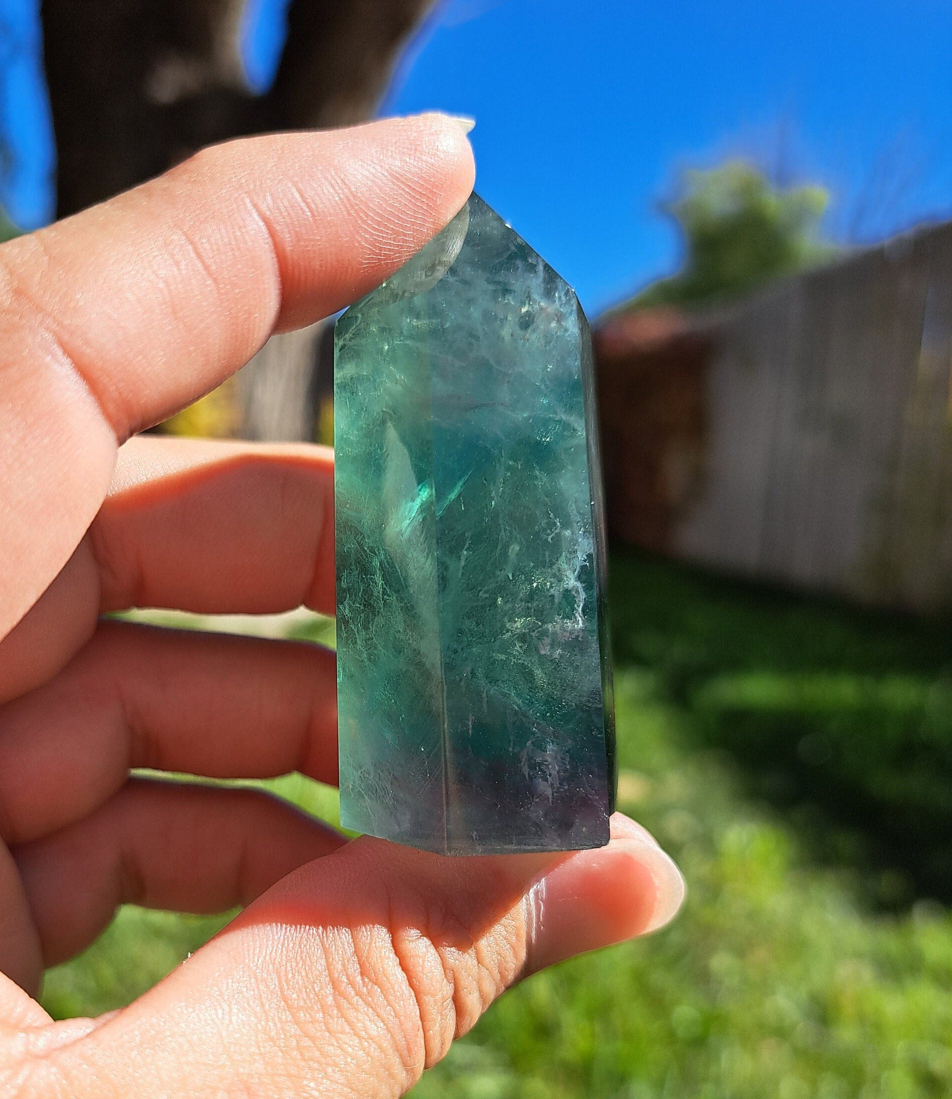 Introducing our stunning Green Fluorite Tower! This exquisite crystal beauty is sure to captivate and mesmerize. Featuring gorgeous natural deep green color, this Fluorite tower is mesmerizing. Handcrafted with precision and love, this tower stands bold as a symbol of spiritual growth and harmony. Its iridescent clarity enhances your intuition and channels positive energy into your sacred space. Whether used for meditation, crystal healing, or simply as a captivating home décor piece, this Green Fluorite Tower is a must-have for your crystal collection. Bring a touch of enchantment to your life and let the vibrant energies of this stunning tower illuminate your space.