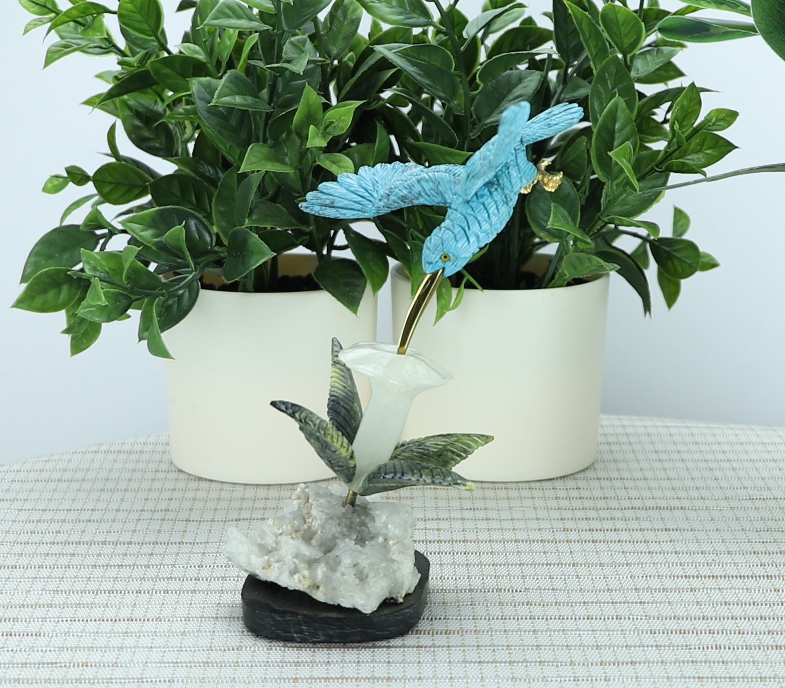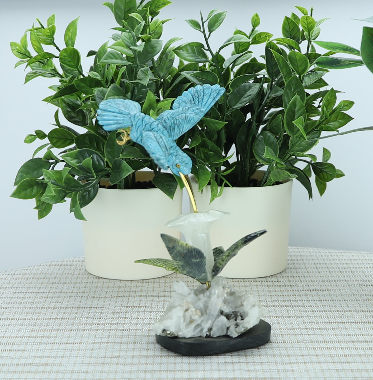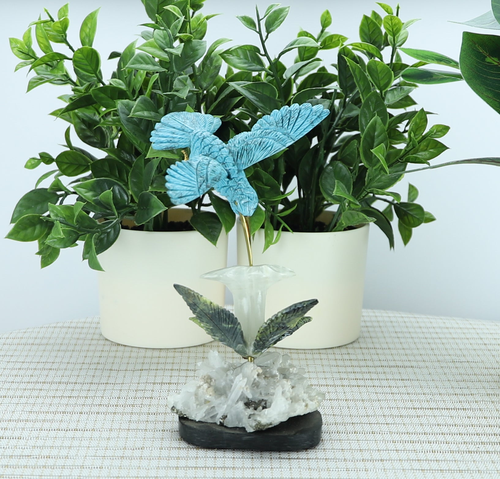 A breathtaking blend of artistry and earth energy, this one-of-a-kind crystal sculpture captures a turquoise-colored hummingbird frozen in mid-flight, delicately sipping nectar from a radiant white onyx flower, surrounded by soft green serpentine leaves—all grounded by a glimmering quartz and pyrite base.