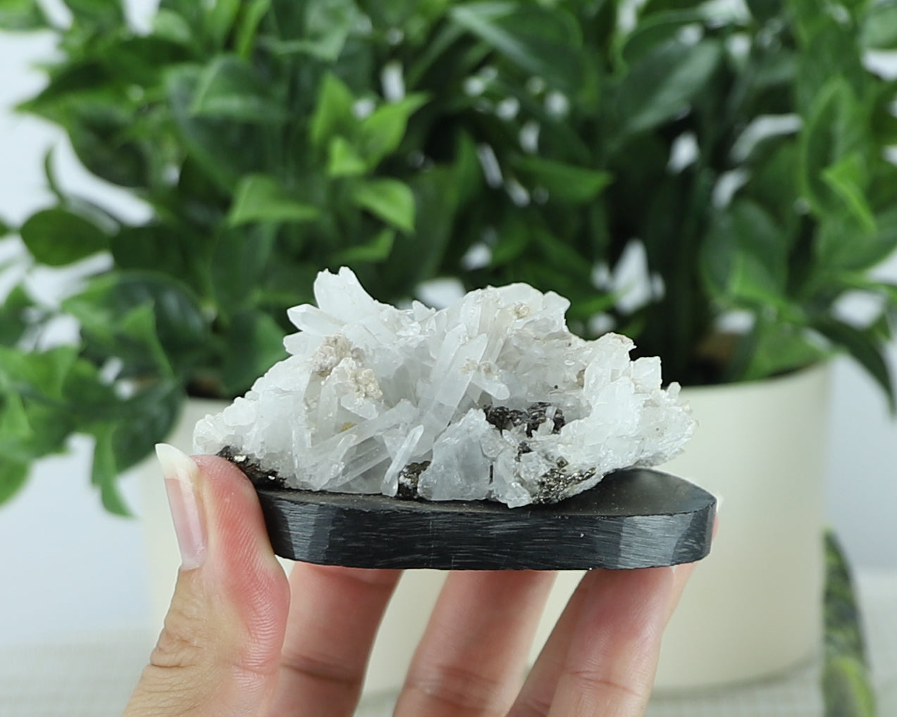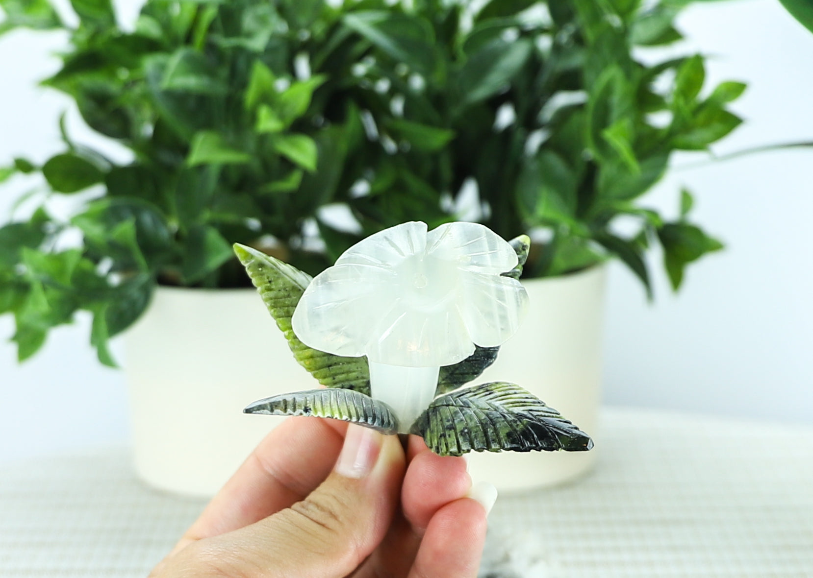 The white onyx flower blooms gently with grace, its petals smooth and polished, contrasting beautifully against the vivid green serpentine leaves, which add an earthy, lifelike depth to the composition. Beneath it all, a dazzling base of quartz and pyrite sparkles with natural brilliance—grounding the piece while adding a touch of magic and abundance.