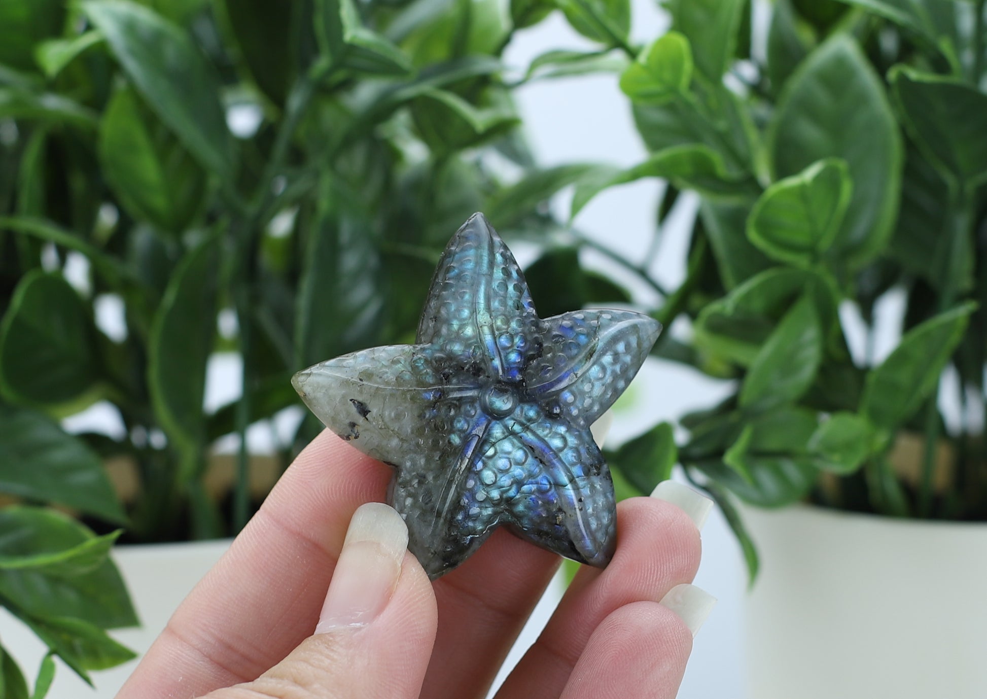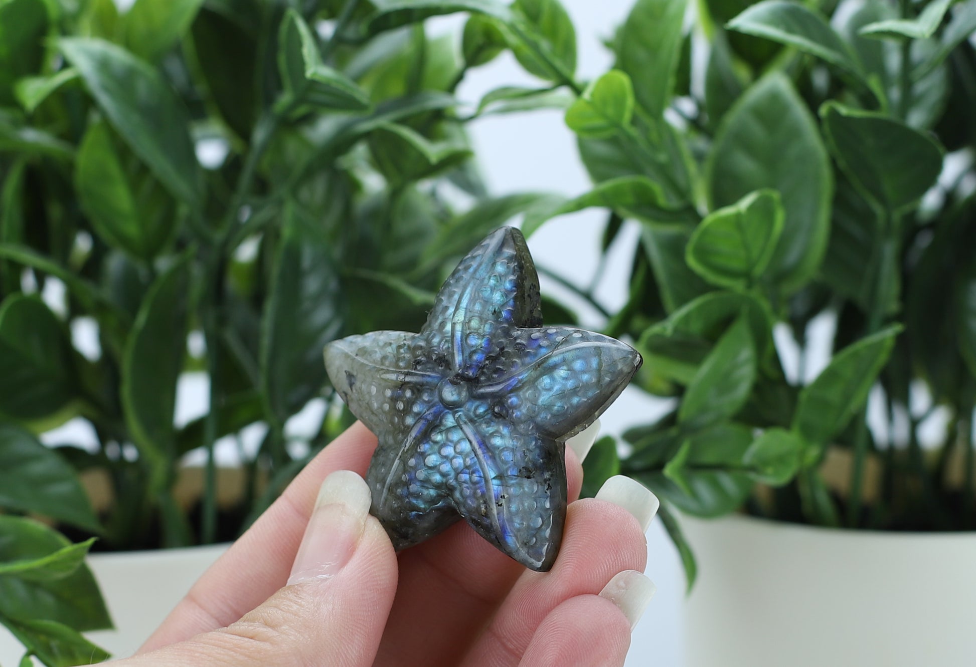Bring the ocean’s mystique and the cosmos’ shimmer together with this stunning Starfish Crystal Carving made from premium, high-grade flashy labradorite. Hand-carved with intricate detailing and rich multicolor flashes, this mesmerizing piece is as much a spiritual talisman as it is a collector’s gem.