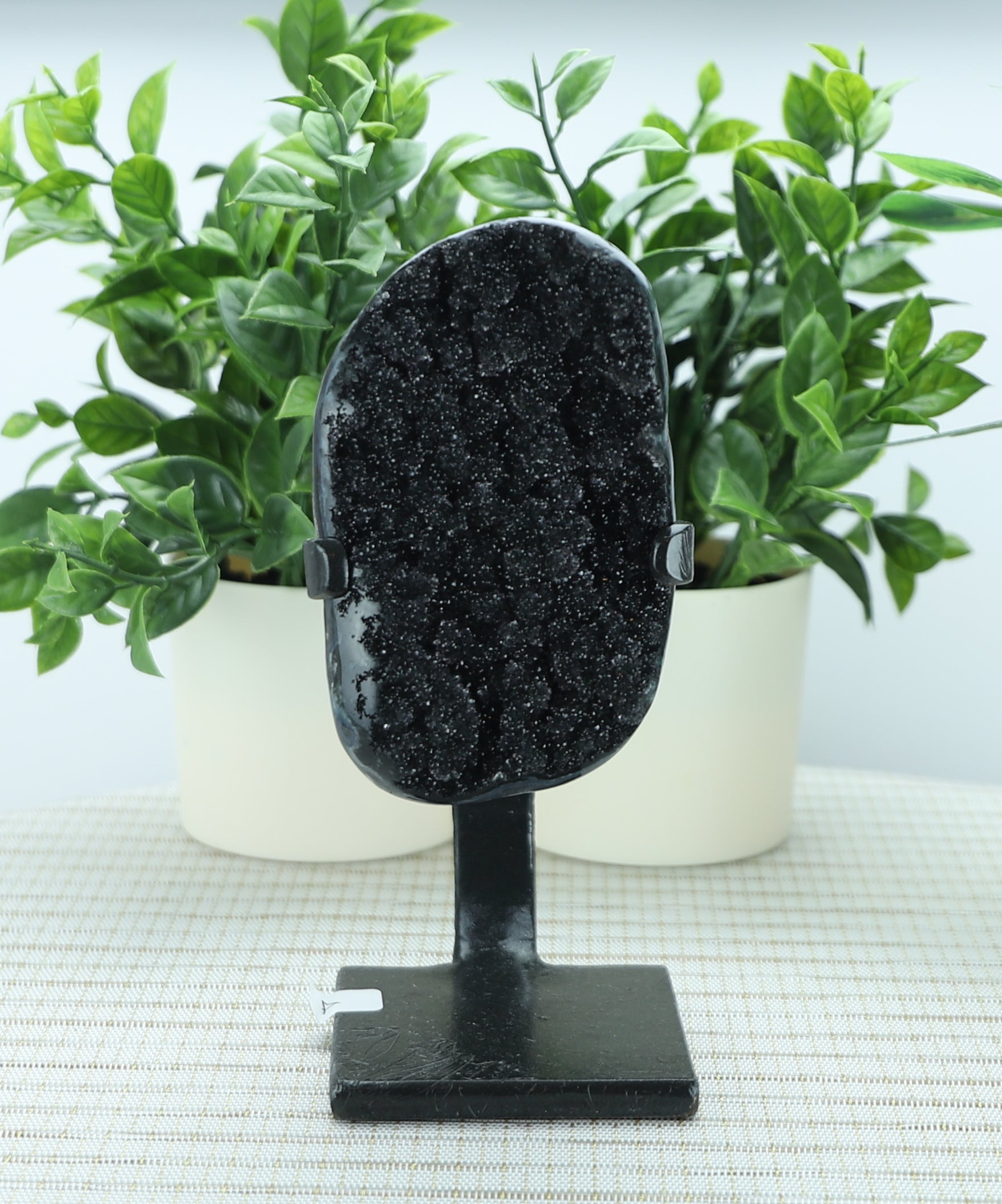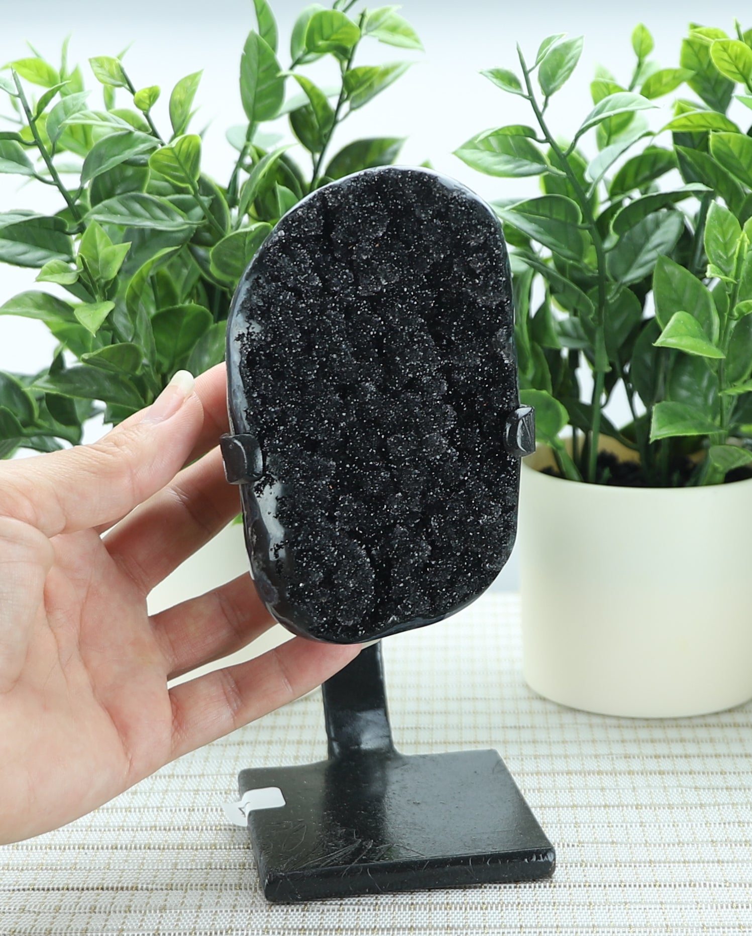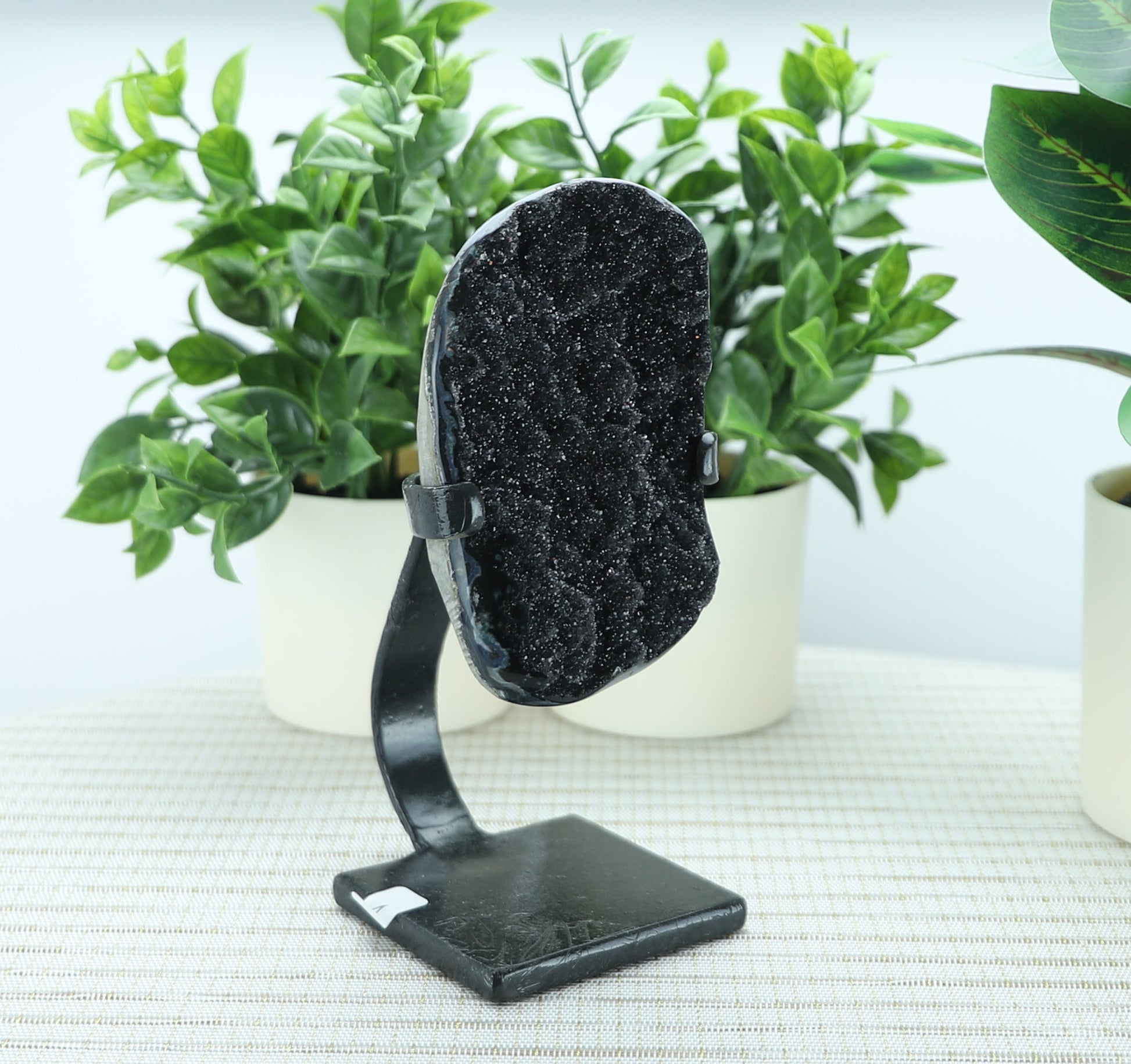 Bring a touch of raw elegance and powerful energy into your space with this striking Black Amethyst Crystal, as a bonus it comes with the metal stand. A rare and captivating variation of traditional amethyst, black amethyst features deep, smoky hues and densely packed crystal points that shimmer with subtle inner light.