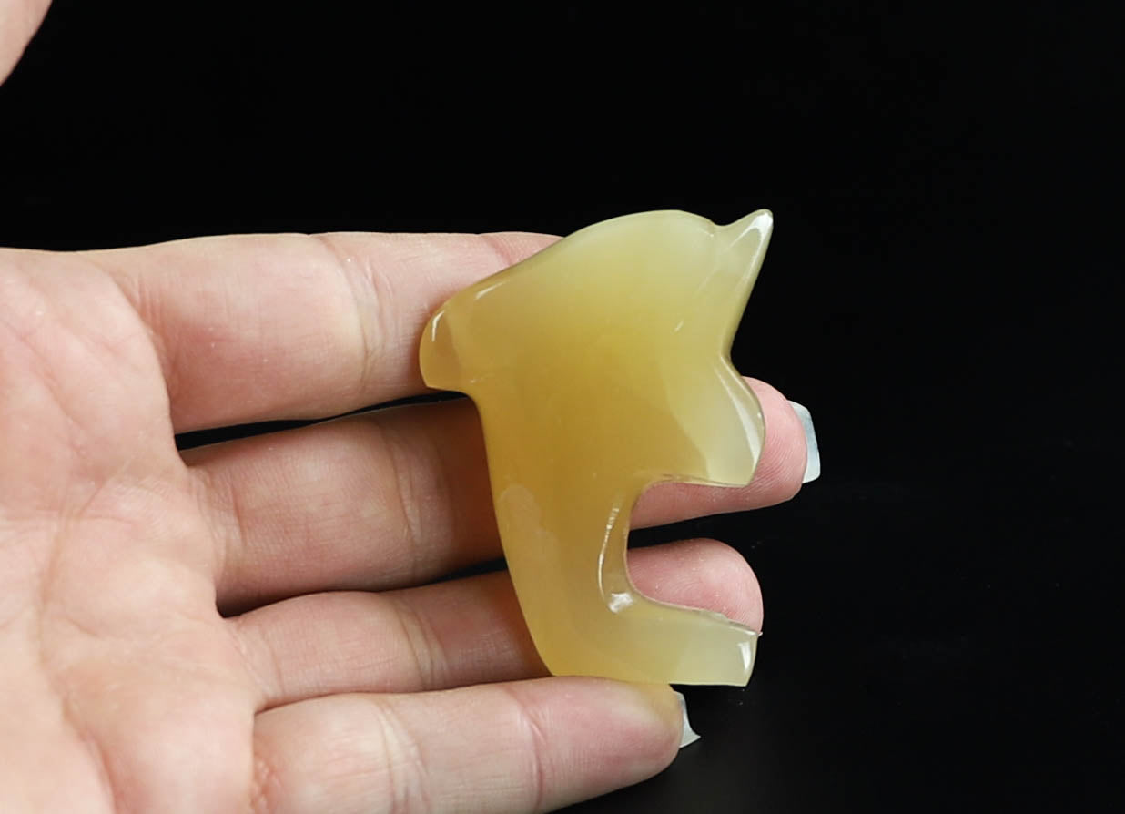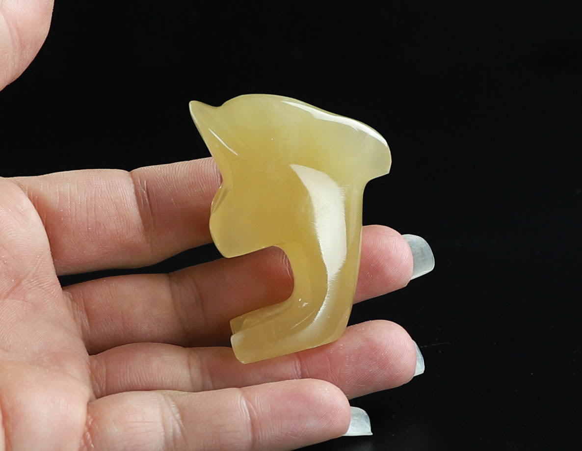 A beautifully hand carved dolphin made out of natural onyx stone and polished to perfection. Dolphin crystals are perfect for those who wish to harness their inner power, spiritual abilities or those looking for a crystal that helps find inner piece. This Crystal dolphin is perfect for your altar, crystal collection or home décor.