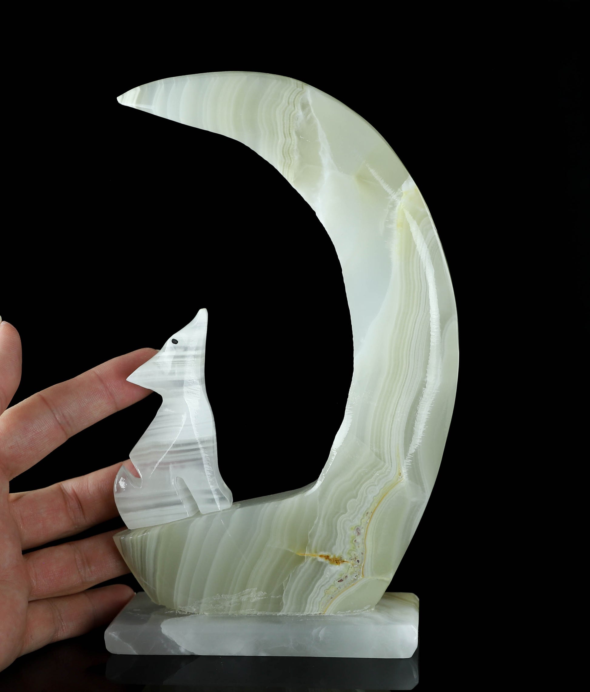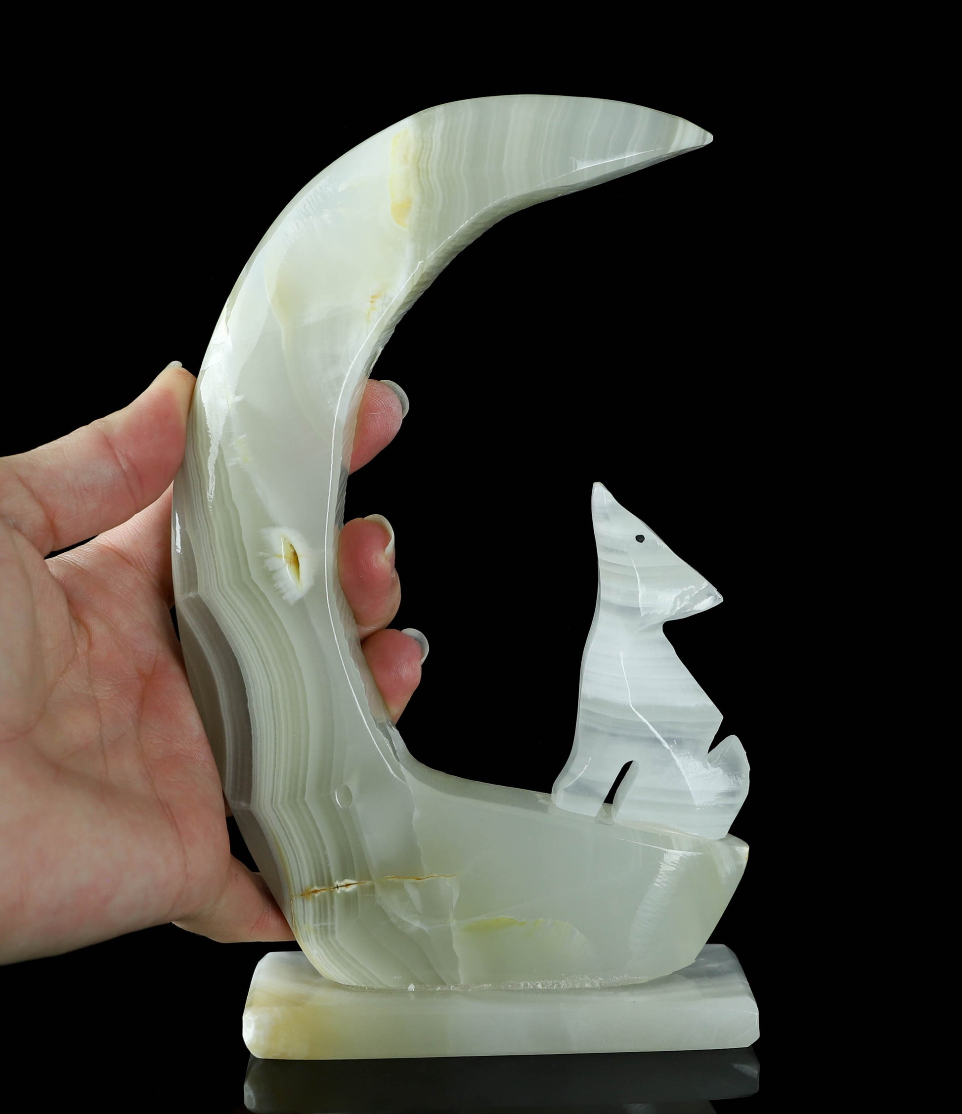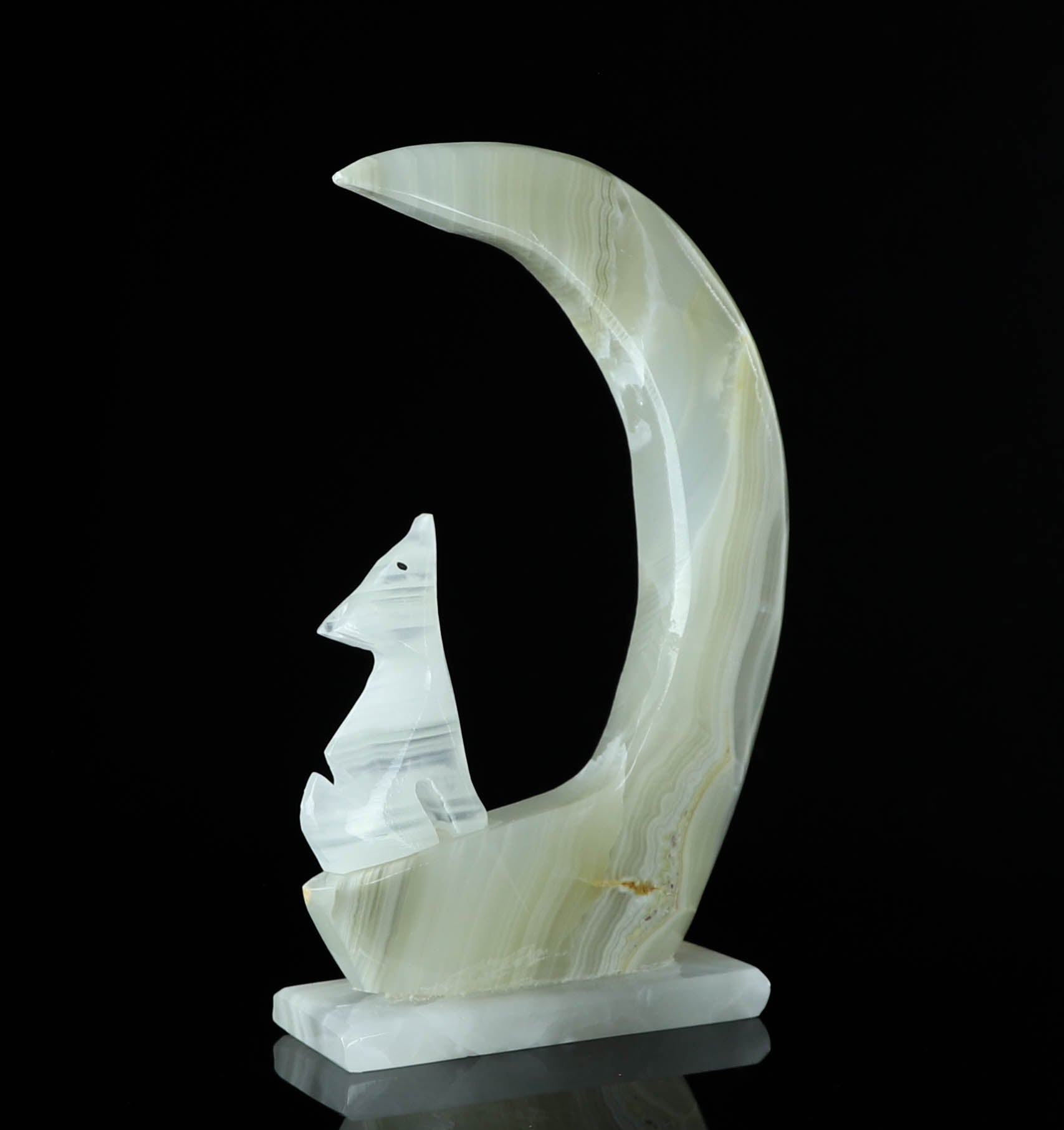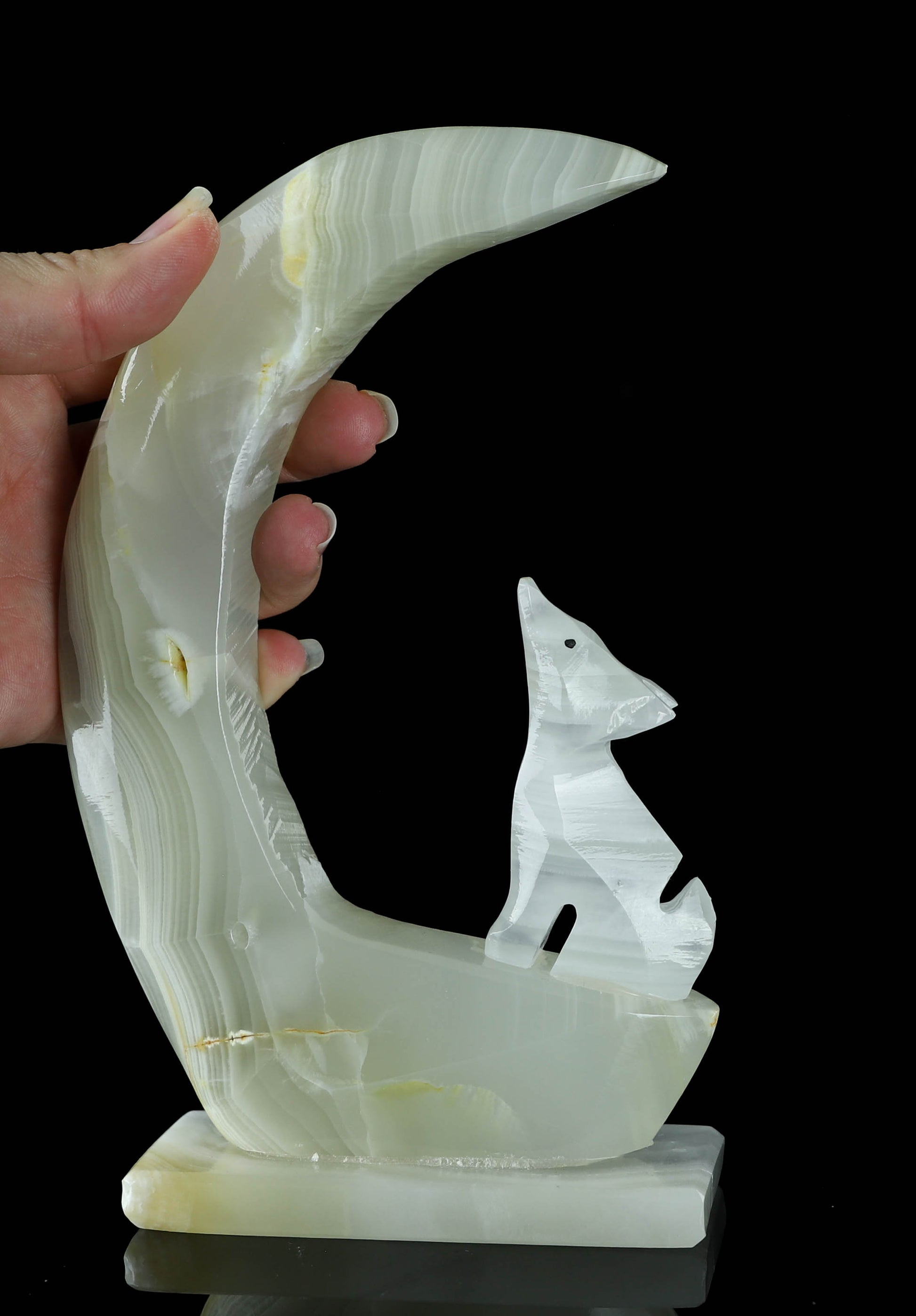 Introducing our exquisite Onyx Wolf & Moon Crystal Carving, a stunning piece of art that harnesses the power of nature's beauty. This unique carving features a magnificent banded Onyx wolf elegantly perched under a crescent moon made out of natural onyx crystal. The bold banding on the wolf and the moon's mesmerizing glow create a harmonious blend of strength and serenity. Handcrafted with precision and love, this enchanting piece is perfect for nature lovers, crystal enthusiasts, and anyone seeking a symbol of guidance and protection. Display it proudly in your home, office or sacred space to infuse an air of mystique and grace. The perfect addition to your unique crystal collection. This Onyx Wolf & Moon Crystal Carving is not only a visual masterpiece but a spiritual treasure that will resonate deeply with your soul.