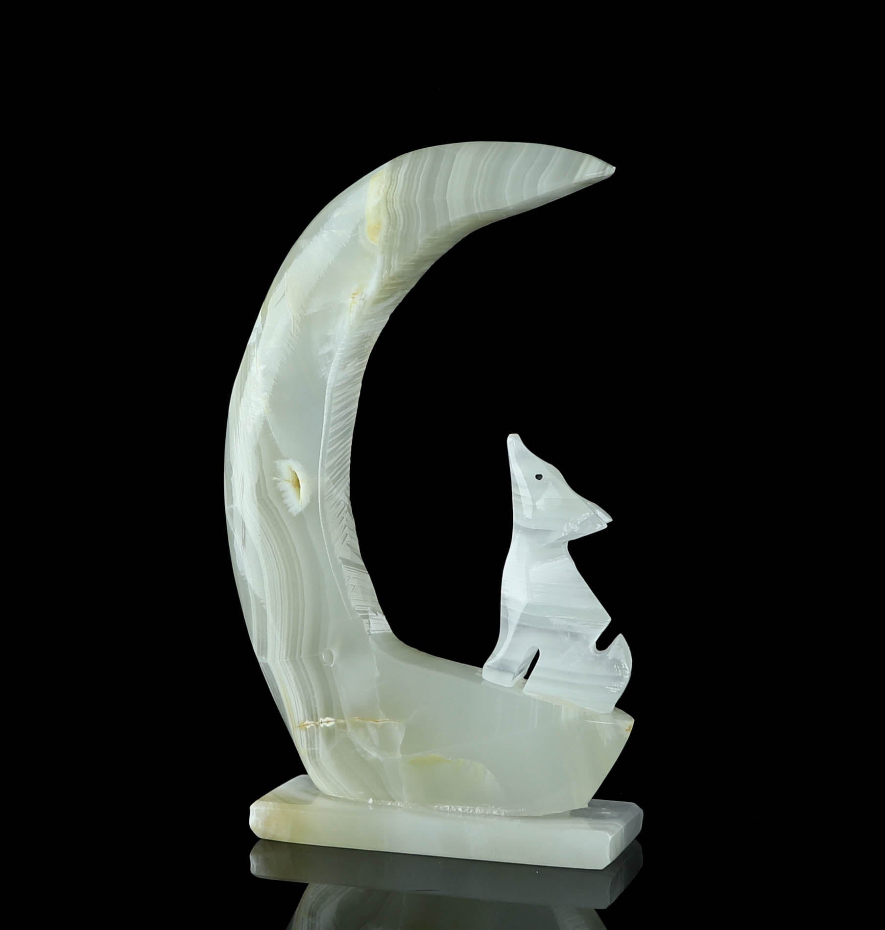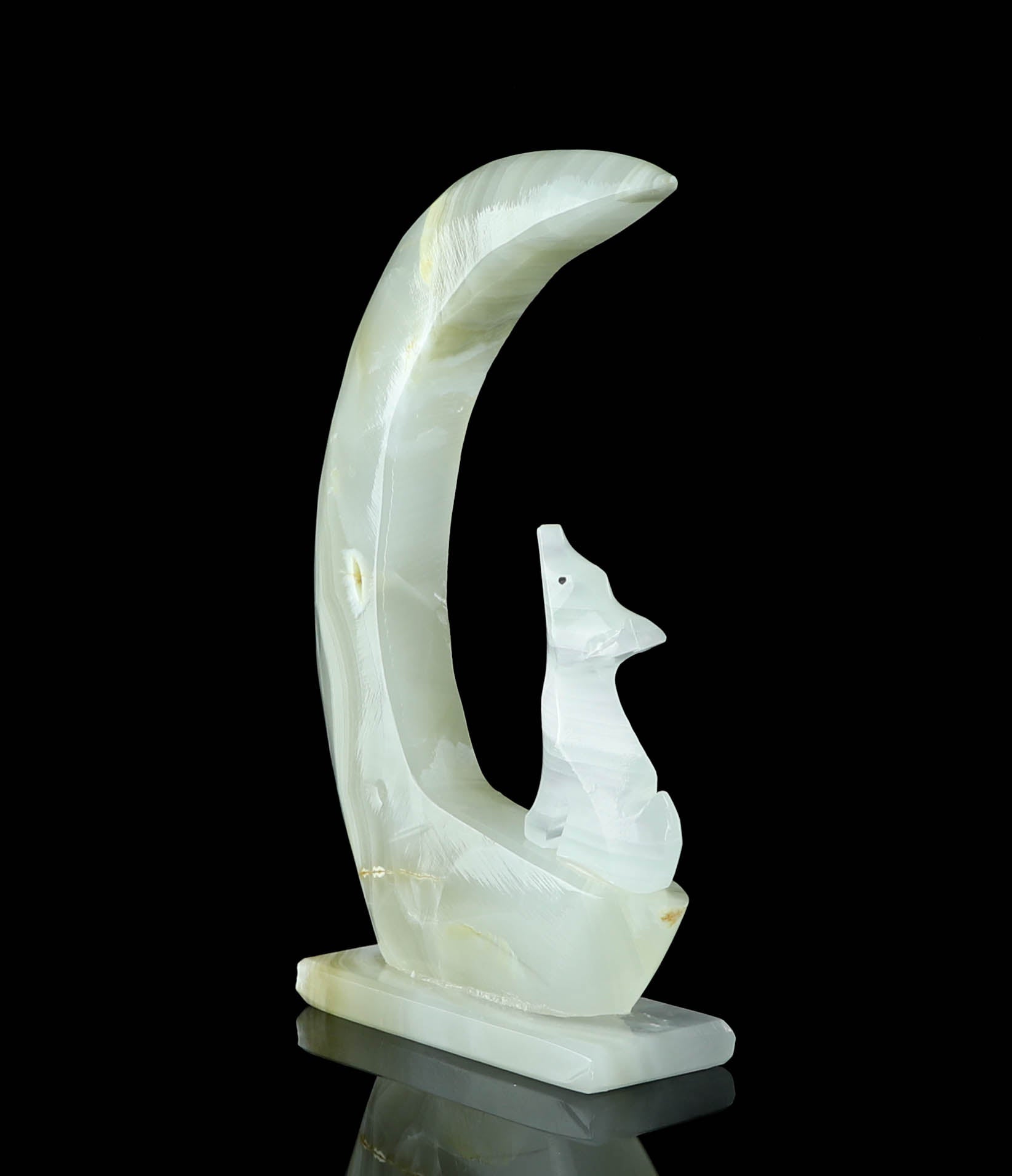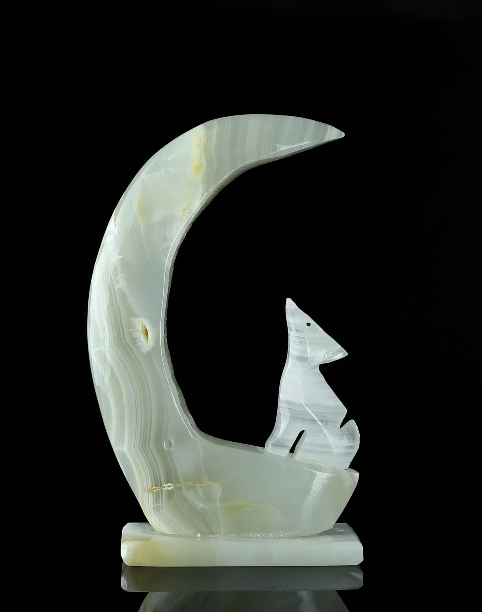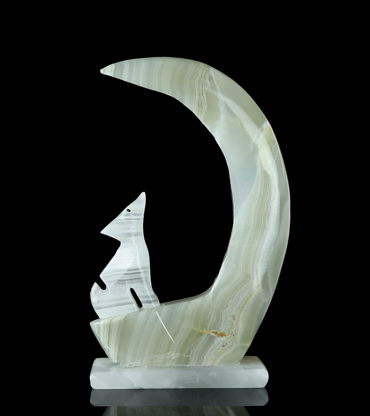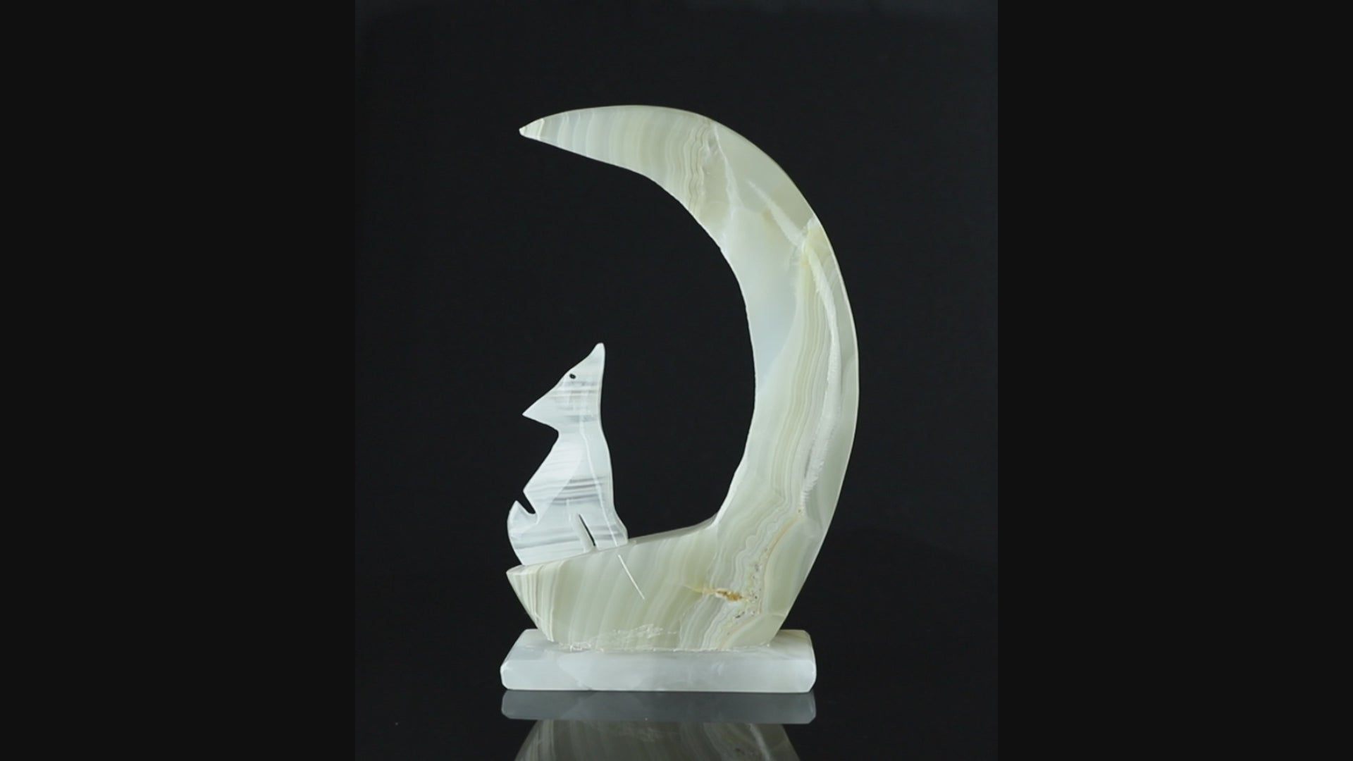 Introducing our exquisite Onyx Wolf & Moon Crystal Carving, a stunning piece of art that harnesses the power of nature's beauty. This unique carving features a magnificent banded Onyx wolf elegantly perched under a crescent moon made out of natural onyx crystal. The bold banding on the wolf and the moon's mesmerizing glow create a harmonious blend of strength and serenity. Handcrafted with precision and love, this enchanting piece is perfect for nature lovers, crystal enthusiasts, and anyone seeking a symbol of guidance and protection. Display it proudly in your home, office or sacred space to infuse an air of mystique and grace. The perfect addition to your unique crystal collection. This Onyx Wolf & Moon Crystal Carving is not only a visual masterpiece but a spiritual treasure that will resonate deeply with your soul.