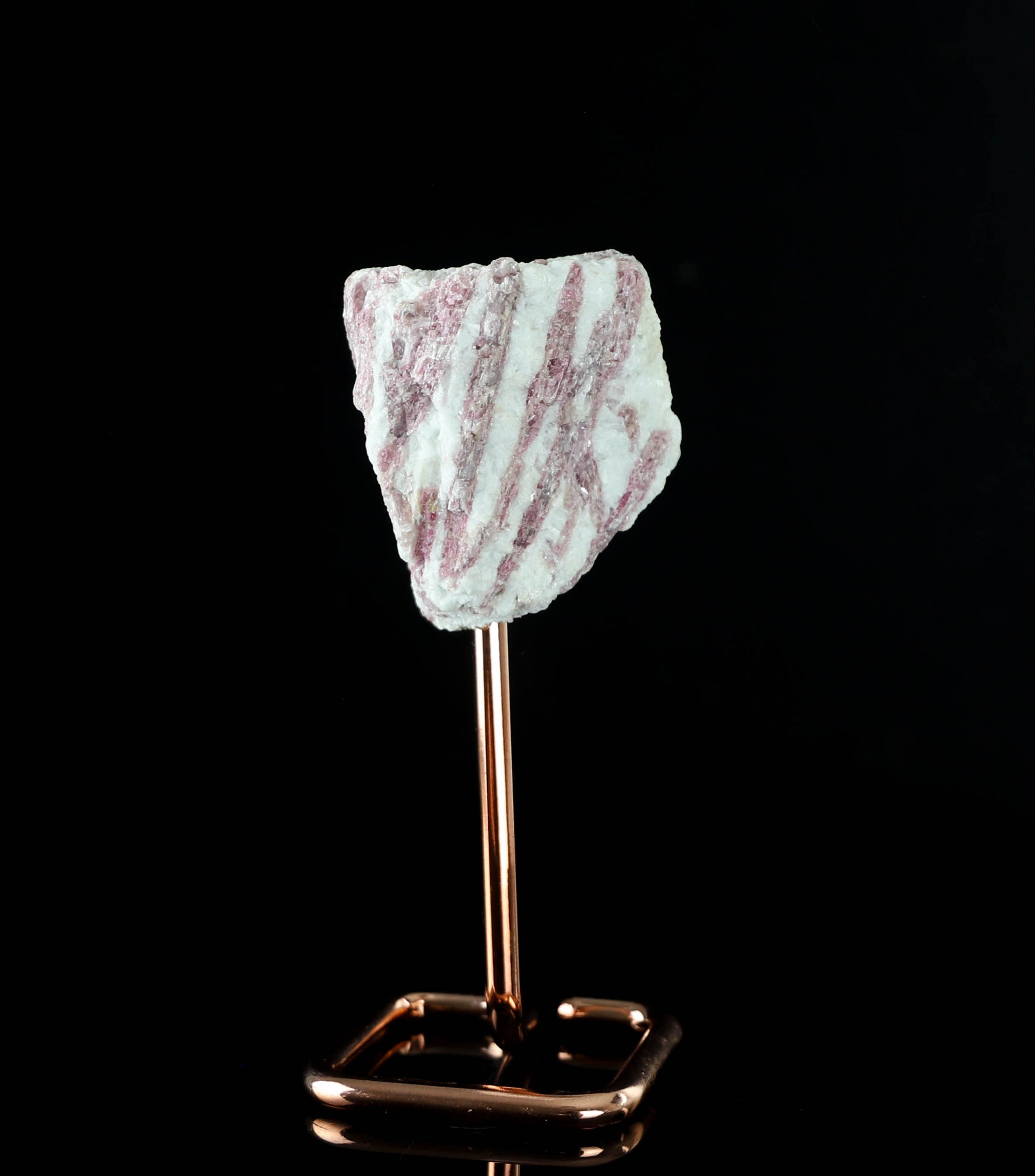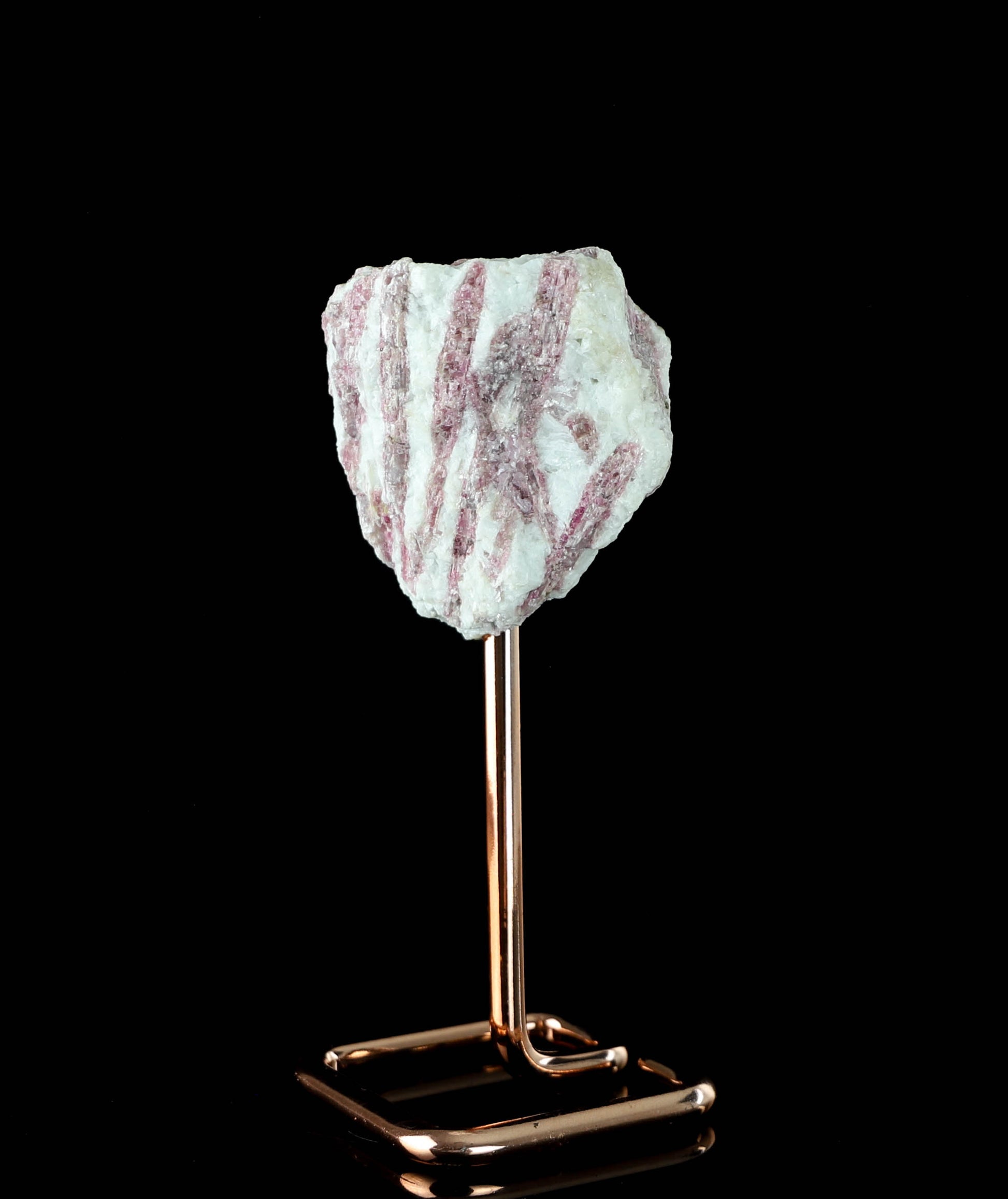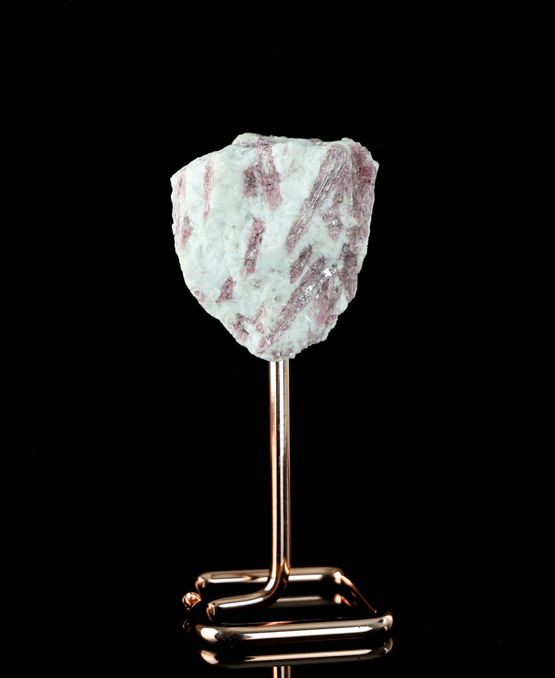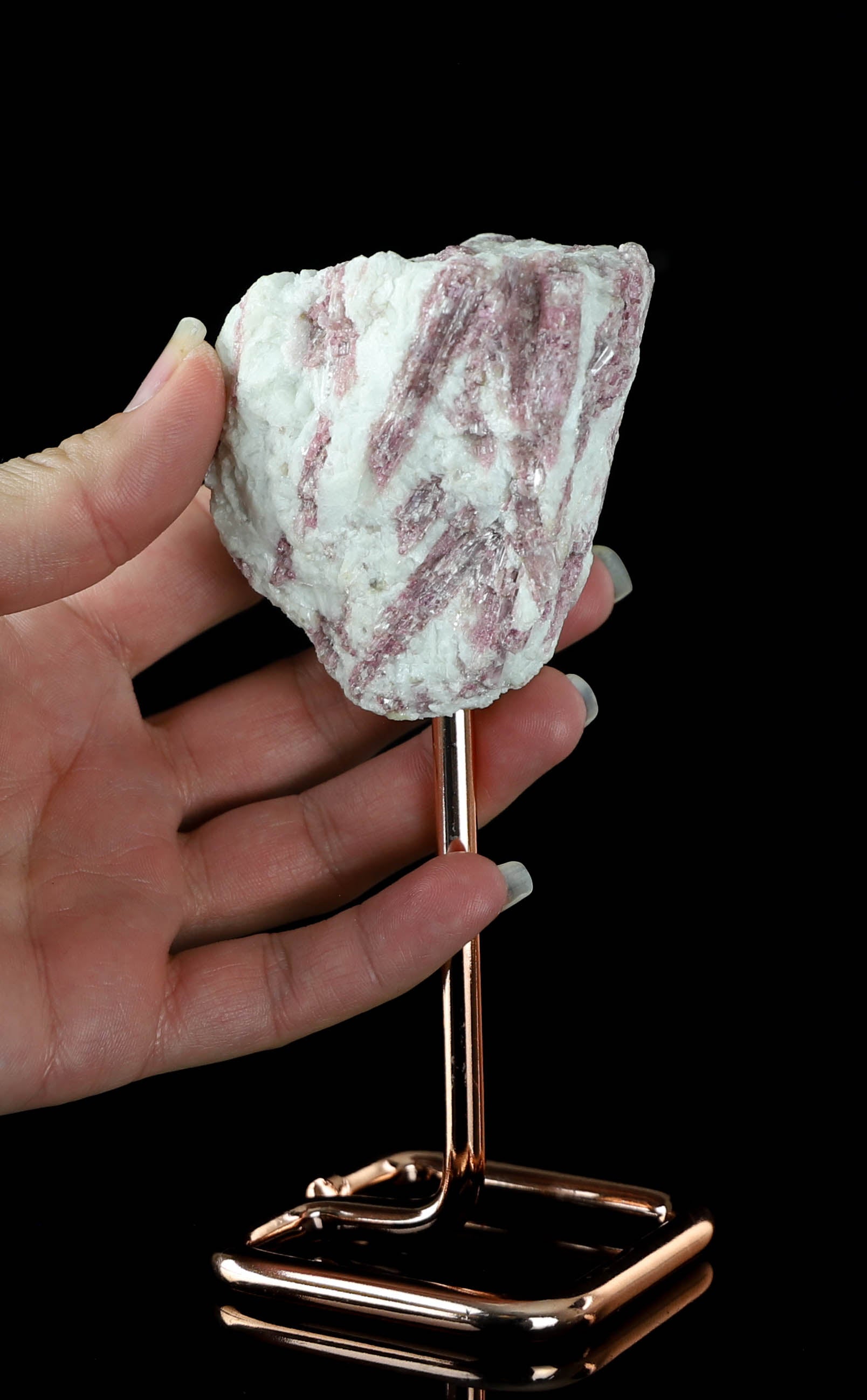 This stunning Pink Tourmaline Crystal on a Rose Colored Stand is a one-of-a-kind beauty that will instantly captivate your heart. The lustrous pink hues of this crystal are mesmerizing, making it a perfect addition to any crystal collection or home décor. Carefully picked from mother nature and displayed on a beautiful rose gold colored stand, this Pink Tourmaline Crystal emits soothing and loving energies that promote harmony and balance in your space. Whether you're a crystal enthusiast or looking for a unique gift, this Pink Tourmaline Crystal is sure to delight and inspire. Don't miss out on owning this magnificent piece of nature's artistry.