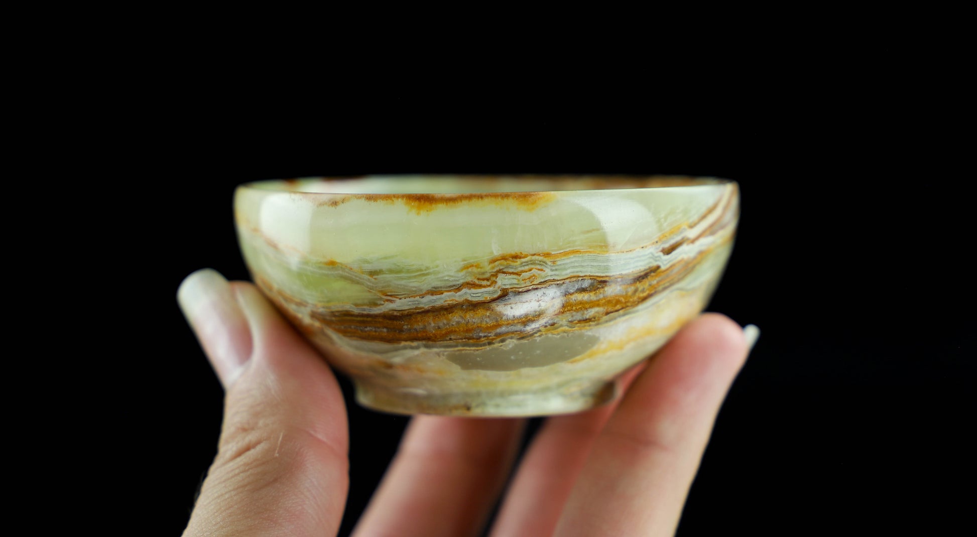 Each Green Onyx Crystal Bowl features unique banding patterns and varying color.