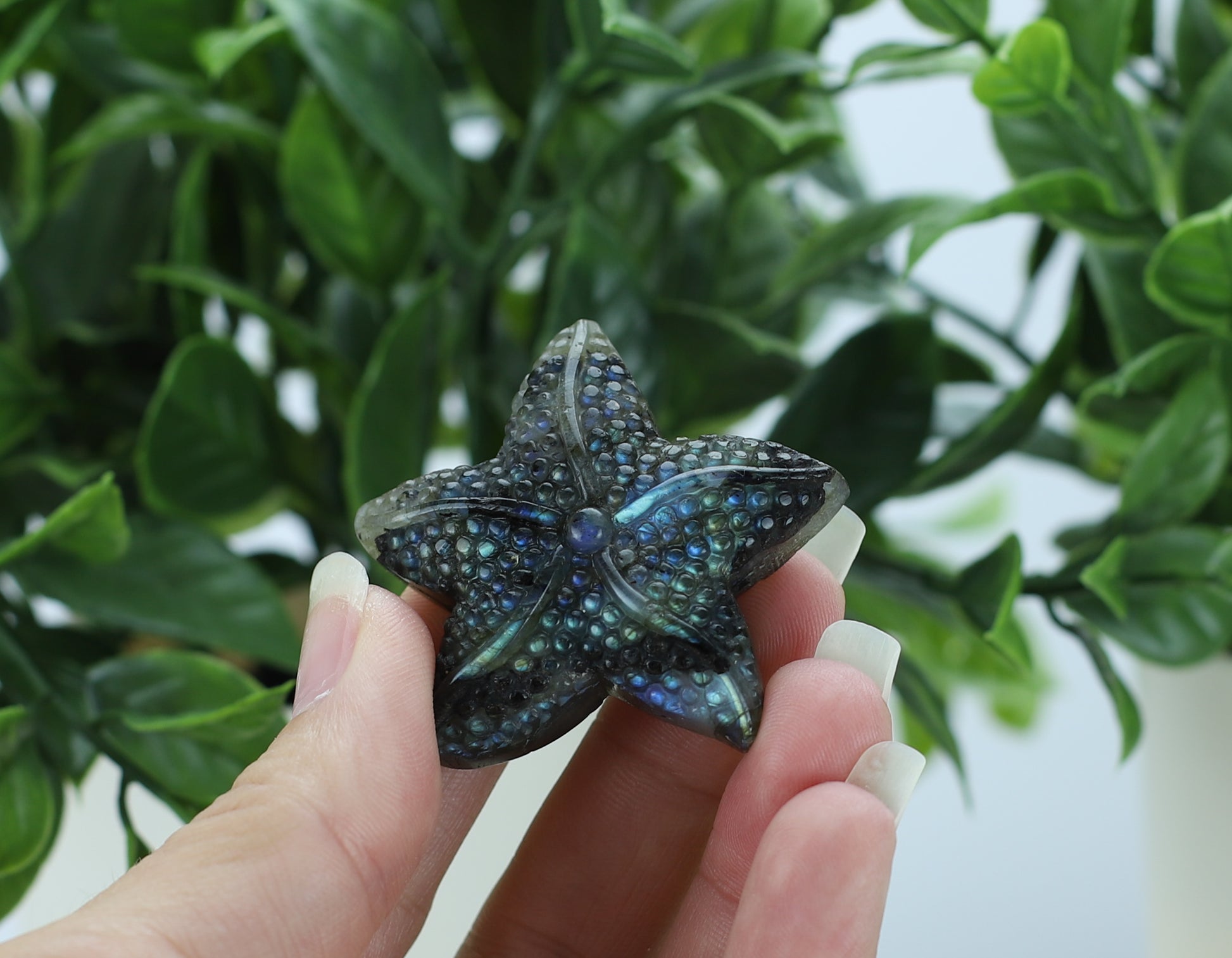 Bring the ocean’s mystique and the cosmos’ shimmer together with this stunning Starfish Crystal Carving made from premium, high-grade flashy labradorite. Hand-carved with intricate detailing and rich multicolor flashes, this mesmerizing piece is as much a spiritual talisman as it is a collector’s gem.